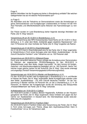 Asylkritische Demonstration in Frankfurt (Oder) am 25.07.2015 An der Versammlung zum Thema „Gegen Asylantenheime und Asylwahn" [sic!] nahmen insgesamt 74 Personen teil. Als Redner fungierten u. a. Vertreter der Partei „Der III. Weg“. Asylkritische Kundgebungen in Zossen und Kloster Lehnin, OT Damsdorf am 01.08.2015 Unter dem Motto „Ausländerstopp, für die Zukunft deutscher Familien“ führte die Par- tei „Der III. Weg“ unter Beteiligung von jeweils 50 Personen Kundgebungen in Zos- sen und Kloster Lehnin durch. Frage 6: Welche Informationen hat die Landesregierung über die Öffentlichkeitsarbeit bzw. Kampagnen dieser Gruppierung? zu Frage 6: Für die Öffentlichkeitsarbeit nutzt „Der III. Weg“ eine eigene Internetseite, einen Y- outube-Channel und soziale Netzwerke wie Twitter und Facebook. Über die Internet- seite können diverse Werbemittel erworben werden, wie Fahnen, Flugblätter, T- Shirts, Jacken oder Kopfbedeckungen. Diese werden von Mitgliedern und Sympathi- santen während öffentlichkeitswirksamer Veranstaltungen auch im Land Branden- burg gezielt offensiv präsentiert. Anfang 2015 startete „Der III. Weg“ im Internet die Kampagne „Kein Asylantenheim in meiner Nachbarschaft“. Mit dieser Kampagne will er Möglichkeiten zur Verhinde- rung von Asylbewerberheimen aufzeigen. Gleichzeitig wird dazu aufgerufen, sich ak- tiv an der Sammlung von Standortdaten der Unterkünfte zu beteiligen. Die Kampag- ne basiert im Wesentlichen auf drei Säulen: Eine Online-Landkarte mit Standorten von Asylbewerberheimen, ein Leitfaden „kein Asylantenheim in meiner Nachbarschaft“ und Werbemittel gegen sogenannte „Asylflut“ und sogenannten Asylmissbrauch. Frage 7: Wurden von Personen, die dieser Gruppierung angehören, Straftaten begangen? Wenn ja, bitte Auflistung nach Ort, Datum, Delikt! zu Frage 7: Der Polizei des Landes Brandenburg sind politisch motivierte Straftaten durch Per- sonen bekannt, die als Akteure für die Partei „Der III. Weg“ in Brandenburg auffällig wurden. Eine personenbezogene Auflistung dieser Straftaten darf aus datenschutz- rechtlichen Gründen nicht erfolgen. Frage 8: Welche Erkenntnisse hat die Landesregierung über die Vernetzung dieser Gruppie- rung mit anderen Gruppierungen, Parteien, freien Kräften und Einzelpersonen der rechten Szene in Brandenburg und bundesweit? zu Frage 8: Bundesweit kennzeichnet „Der III. Weg“ eine Nähe zu Neonationalsozialisten und ein eher distanziertes Verhältnis zur NPD. Jedoch gibt es mit den Themen „Asylmiss-