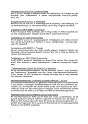 Plakatierung am 28.04.2015 in Wittstock/Dosse Am 28.04.2015 erfolgte in Wittstock/Dosse die Feststellung von Plakaten mit der Aufschrift „Kein Asylantenheim in meiner Nachbarschaft! www.DER-DRITTE- WEG.info“. Kundgebung am 08.05.2015 in Wittenberge Anlässlich des 08. Mai fand in Wittenberge eine Kundgebung unter Beteiligung von ca. 40 Personen statt. Ein Vertreter der Partei „Der III. Weg“ fungierte als Redner. Grabpflege am 08.05.2015 in Angermünde Auf dem Facebook Portal der Partei „Der III. Weg“ wurde ein Artikel eingestellt, der auf eine Grabpflegeaktion anlässlich des 08. Mai in Angermünde hinweist. Flugblattaktion am 19.05.2015 in Cottbus Am 19.05.2015 wurden an Hauseingangstüren im Stadtgebiet von Cottbus mehrere Flyer mit der Auf-schrift „Kein Asylheim in meiner Nachbarschaft – www.der-dritte- weg.info“ festgestellt. Kundgebung am 23.05.2015 in Pritzwalk Bei der Versammlung unter dem Motto „Asylflut stoppen“ fungierten Vertreter der Kampagne „Tag der deutschen Zukunft“ und der Partei „Der III. Weg“ als Redner. Es nahmen 40 Personen teil. Flugblattaktion am 25.05.2015 in Angermünde Am 25.05.2015 wurden im Stadtgebiet von Angermünde mehrere Flyer mit der Auf- schrift „Kein Asylheim in meiner Nachbarschaft – www.der-dritte-weg.info“ festge- stellt. „Tag der deutschen Zukunft“ am 06.06.2015 in Neuruppin An der Versammlung/Demonstration „Tag der deutschen Zukunft – unser Signal ge- gen Überfremdung“, angemeldet durch die „Freien Kräfte Neuruppin/Osthavelland“ (FKN), nahmen ca. 600 Personen teil. Vertreter der Partei „Der III. Weg“ befanden sich unter den Teilnehmern. Informationsveranstaltung (Asylbezug) in Kloster Lehnin am 17.06.2015 Eine Informationsveranstaltung zur geplanten Unterbringung von 600 Asylbewerbern in der örtlichen, ehemaligen Bundeswehrkaserne verlief mit 400 Teilnehmern stö- rungsfrei. Ca. 25 Personen der rechten Szene wurde unter Ausübung des Haus- rechts der Zutritt zum Versammlungsraum untersagt. Dieser Personenkreis verteilte im weiteren Flyer der Partei „Der III. Weg“ im Umfeld des Veranstaltungsraumes. Asylkritische Mahnwache in Wittstock/Dosse am 26.06.2015 An einer Mahnwache der Partei „Der III. Weg" zum Thema „Ausländerstopp, für die Zukunft deutscher Familien!" nahmen insgesamt 50 Personen teil. Sie trugen T- Shirts mit dem Aufdruck „Der dritte Weg". Ein Verbot der Versammlungsbehörde hin- sichtlich des Tragens der Shirts wurde durch Eilentscheid des Verwaltungsgerichtes Potsdam am 26.06.2015 aufgehoben.
