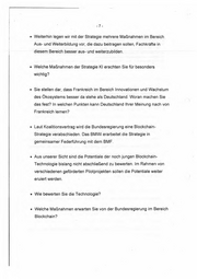 7 • Weiterhin legen wir mit der Strategie mehrere Maßnahmen im Bereich Aus- und Weiterbildung vor, die dazu beitragen sollen, Fachkräfte in diesem Bereich, besser aus- und weiterzubilden. • Welche Maßnahmen der Strategie K1 erachten Sie Юг besonders wichtig? • Sie stellen dar, dass Frankreich im Bereich Innovationen und Wachstum des 4kosystems besser da stehe als Deutschland. Woran machen Sie das fest? In welchen Punkten kann Deutschland Ihrer Meinung nach von Frankreich lernen? • Laut Koalitionsvertrag wird die Bundesregierung eine Blockchain- Strategie verabschieden. Das BMWi erarbeitet die Strategie in gemeinsamer Federführung mit dem BMF. • Aus unserer Síсht sind die Potentiale der noch jungen Blockchain- Technologie bislang nicht abschließend zu bewerten. Im Rahmen von verschiedenen geförderten Pilotprojekten sollen die Potentiale weiter eruiert werden. • Wie bewerten Sie die Technologie? . Welche Maßnahmen erwarten Sie von der Bundesregierung im Bereich Blockchain?