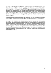 zu Frage 2: Die Abgabe von Rohmilch an Verbraucher über Milchtankstellen bzw. Milchautomaten an Orten, die sich außerhalb des Milcherzeugungsbetriebes befin- den, ist gemäß § 17 Tierische-Lebensmittel-Hygieneverordnung verboten. Der Ge- setzgeber hat dieses Verbot aus Gründen des vorbeugenden Gesundheitsschutzes erlassen. Eine Aufhebung dieses Verbotes dürfte daher außer Frage stehen. Die Ab- gabe pasteurisierter Milch durch den Erzeuger über Milchtankstellen im regionalen Umfeld seines Betriebes ist in Bezug auf die geltenden Rechtsvorschriften grund- sätzlich möglich. Frage 3: Welche Fördermöglichkeiten gibt es derzeit im Land Brandenburg, den Ab- satz von Roh- und/oder pasteurisierter Milch über Milchtankstellen zu unterstützen? zu Frage 3: Die Errichtung von Milchtankstellen kann im Rahmen der Richtlinie des MLUL über die Gewährung von Zuwendungen für einzelbetriebliche Investitionen in landwirtschaftlichen Unternehmen vom 13. April 2016 gefördert werden. Die Maß- nahme dient nach der genannten Richtlinie der Direktvermarktung landwirtschaftli- cher Erzeugnisse durch das antragstellende landwirtschaftliche Unternehmen. Das Mindestinvestitionsvolumen muss 20.000 € betragen. Die Förderung beträgt 20% der zuwendungsfähigen Investitionskosten. Das maximale förderfähige Investitionsvolu- men beträgt 2,0 Mio. €.