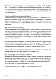 Die Voraussetzungen für die öffentliche Zustellung prüft der zuständige Entscheider (§ 10 Abs. 1 Satz 2 VwZG). Die Akte wird bei Vorliegen der Voraussetzungen für die Zustellungs- form in die Aktivität „Öffentliche Bescheidzustellung“ geleitet – sofern diese angeboten wird – ansonsten wird die Akte aus der aktuellen Aktivität mit dem Zustellungsauftrag an das AVS weitergeleitet. Hinweis zur Zustellung von anderen Schriftstücken: Andere Schriftstücke, beispielsweise Ladungen, Aufforderungen zur Stellungnahme etc., die öffentlich zugestellt werden sollen, dürfen nicht über den Prozessschritt „Öffentliche Bescheidzustellung“ an das AVS weitergeleitet werden. In diesen Fällen ist die Benach- richtigung über die öffentliche Zustellung (D0205) händisch zu erstellen, auszudrucken und einzufrieren. 8.2. Erneute Bescheidzustellung Wurde der Antragsteller ordnungsgemäß nach § 10 AsylG belehrt und wird ein Bescheid nach einem Zustellversuch zurückgesandt, weil er dem Ausländer an die zuletzt bekannte Anschrift nicht zugestellt werden konnte, kommt eine erneute Bescheidzustellung grund- sätzlich nicht in Betracht. Nach § 10 Abs. 2 AsylG, gilt eine Zustellung an den Antragsteller unter der zuletzt bekannten Anschrift mit der Aufgabe zur Post als bewirkt, selbst wenn diese als unzustellbar zurückkommt. Eine erneute Bescheidzustellung wird nur dann durchgeführt, wenn der Antragsteller nach Wohnungswechsel seiner Pflicht der Anschriftenmitteilung gem. § 10 Abs. 1 AsylG nachgekommen ist und der Bescheid ohne Verschulden des Antragstellers an dessen vor- her bekannte Anschrift gesandt wurde und dort nicht zugestellt werden konnte. Gleiches gilt, wenn eine Verfahrensvollmacht vorlag, und diese zum Zeitpunkt der Bescheidzustellung in der Maske „Vertreter“ noch nicht erfasst war. 8.3. Zustellung in Gemeinschaftsunterkünften Kommt es in Gemeinschaftsunterkünften vermehrt zu Fällen, in denen auch wiederholte Zustellungsversuche erfolglos bleiben, ist vor Ort mit der zuständigen ABH zu klären, welche Gründe hierfür vorliegen und wie ggf. Abhilfe geschaffen werden kann (z. B. Zustellung ge- gen Empfangsbekenntnis in Amtshilfe durch ABH). Erforderliche Vereinbarungen sind ggf. durch die RL oder von ihr beauftragte Personen zu treffen. Die gesetzliche Regelung des § 10 Abs. 2 AsylG bleibt jedoch unberührt. Bescheid 10/11 Stand 07/22