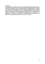Landtag Brandenburg Drucksache 6/4206 6. Wahlperiode Antwort der Landesregierung auf die Kleine Anfrage 1658 der Abgeordneten Kerstin Kircheis der SPD-Fraktion Drucksache 6/4023 Bundesverkehrswegeplan und 2. und 3. VA Ortsumgehung CB Gallinchen Namens der Landesregierung beantwortet die Ministerin für Infrastruktur und Lan- desplanung die Kleine Anfrage wie folgt: Vorbemerkung der Fragestellerin Die Ortsumgehung Cottbus (B168/B97) wird bereits seit 1993 geplant. Sie ist in drei Verkehrsabschnitte (VA) unterteilt. Der erste Verkehrsabschnitt wurde im September 2012 für den Verkehr freigegeben. Der 2. Verkehrsabschnitt be- findet sich in Planung. Der dritte Verkehrsabschnitt ist im Bundesverkehrs- wegeplan nur als Vorhaben des weiteren Bedarfs aufgenommen worden. Frage 1: Wie ist der Stand der Bearbeitung der Planfeststellungsunterlagen zum 2. VA der Ortsumgehung, für die der Bund am 13.07.15 den Gesehenvermerk erteilt hat? zu Frage 1: Derzeit werden die Unterlagen für die Planfeststellung erarbeitet. Im Frühjahr 2016 wurde mit der Aktualisierung der faunistischen Daten begonnen. Frage 2: Wann ist mit der formellen Einleitung des Planfeststellungsverfahrens durch das Land zu rechnen? zu Frage 2: Die Übergabe der Planfeststellungsunterlagen an die Anhörungsbehörde ist für das 2. Halbjahr 2016 avisiert. Frage 3: Wie bewertet das Land die Auswirkungen des Bundesverkehrswegeplans für den 3. VA der OU Cottbus (Ortsumgehung Gallinchen)? Datum des Eingangs: 20.05.2016 / Ausgegeben: 25.05.2016