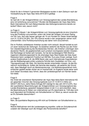 Landtag Brandenburg Drucksache 6/1259 6. Wahlperiode Antwort der Landesregierung auf die Kleine Anfrage 445 des Abgeordneten Stefan Hein fraktionslos Drucksache 6/961 Pensionsfond des Landes Brandenburg Wortlaut der Kleinen Anfrage 445 vom 25.03.2015: Aus der Antwort der Landesregierung auf die Kleine Anfrage 267 des Abgeordneten Christoph Schulze (DS 6/821) geht hervor, dass 17.236.660 Euro des Pensionsfonds des Landes Brandenburg in Form von Bankanleihen mit Gewährträgerhaftung bei der ehemaligen Kärntner Landesbank Hypo Alpe-Adria Bank International AG ange- legt wurden. Im Jahr 2009 übernahm die Republik Österreich die finanziell massiv bedrohte Hypo Alpe-Adria Bank International AG zu 100% von der Bayern LB. Die österreichische Finanzmarktaufsicht und die österreichische Regierung haben nun ein Zahlungsmoratorium für die Hypo-Alpe-Abwicklungsbank Heta Asset Resolution verhängt. 2014 verabschiedete das österreichische Parlament ein Sondergesetz, das einen Ausschluss der Gewährträgerhaftung bzw. einen Schuldenschnitt zulasten der Gläubiger zur Folge haben könnte. Laut eines FAZ Artikels vom 06.03.2015 wird ein Schuldenschnitt von 50% erwartet. Ich frage die Landesregierung: 1. Sind durch das verhängte Zahlungsmoratorium Einnahmeausfälle für den Pensi- onsfond entstanden? Wenn ja, in welcher Höhe? 2. Wann wurden Anleihen (Kaufdatum und Höhe) der Hypo Alpe-Adria Bank Inter- national AG erworben? 3. Wurden nach der Verstaatlichung bzw. nach Einsetzung der Abwicklungsgesell- schaft Heta Asset Resolution weitere Anlagen für den Pensionsfond erworben? 4. Ist nach §5 (1) der Anlagerichtlinien zum Versorgungsfond des Landes Branden- burg eine Umschichtung vorzunehmen? Wurden die Wertpapiere der Hypo Alpe- Adria Bank International AG nach Bekanntwerden des Zahlungsmoratoriums be- reits veräußert? Wenn nein, warum nicht? 5. Der Anteil der erworbenen Bankanleihen der Hypo Alpe-Adria Bank International AG am gesamten Volumen des Versorgungsfonds (zum 31.12.2013 in Höhe von 328.877.203 Euro, siehe Kleine Anfrage 267) beträgt für das Jahr 2013 5,24%. Aus den quantitativen Beschränkungen der Anlagerichtlinien zum Versorgungs- fond des Landes Brandenburg, gesetzlich festgeschrieben im §4 (1) d, wird er- sichtlich, dass die Beschränkung für Aktien von Unternehmen auf 5% beschränkt ist. Trifft dies nicht auch äquivalent auf Emittenten von Schuldscheinen zu? Wenn ja, warum wurde diese 5% Schwelle überschritten?