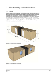 5 Entwurfsvorschlag auf Basis der Ergebnisse 5.1 Entwurf Aufgrund des einfachen Aufbaus, der guten Modularität, des geringen Lagervolumens, der voraussichtlich hohen Lebensdauer und der einfachen Wartung ist ein detaillierter Entwurf auf Basis von Variante 2 (Kapitel 2.4.2) entstanden. Zwei Seitenmodule werden durch ein Mittelmodul verbunden. In diesem Entwurf wird jedoch aus Kosten- und aus Feuchteschutzgründen eine Variante zum Stecken und nicht zum Klappen realisiert. Um den Klappmechanismus realisieren zu können, müssten die Längswände auf Podesten sitzen (siehe Abbildung 26). Diese durchbrechen die Dämmebene, erhöhen die Bauteilanzahl und somit die Kosten. Abbildung 49: Entwurfsansicht aus Nordwest Abbildung 50: Entwurfsansicht aus Südwest Fraunhofer IVI 46 | 72 2022