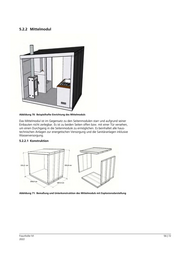 5.2.2 Mittelmodul Abbildung 70: Beispielhafte Einrichtung des Mittelmoduls Das Mittelmodul ist im Gegensatz zu den Seitenmodulen starr und aufgrund seiner Einbauten nicht zerlegbar. Es ist zu beiden Seiten offen bzw. mit einer Tür versehen, um einen Durchgang in die Seitenmodule zu ermöglichen. Es beinhaltet alle haus- technischen Anlagen zur energetischen Versorgung und die Sanitäranlagen inklusive Wasserversorgung. 5.2.2.1 Konstruktion Abbildung 71: Bemaßung und Unterkonstruktion des Mittelmoduls mit Explosionsdarstellung Fraunhofer IVI 56 | 72 2022