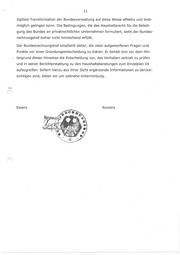 11 digitale Transformation der Bundesverwaltung auf diese Weise effektiv und best- möglich gelingen kann. Die Bedingungen, die das Haushaltsrecht für die _Beteili- gung des Bundes an privatrechtlichen Unternehmen formµliert, sieht der Bundes- rechnungshof bisher nicht hinreichend erfüllt. Der Bundesrechnungshof empfiehlt daher, die oben aufgeworfenen Fragen und Punkte vor einer Gründungsentscheidung zu klären. Er behält sich vor dem Hin- . tergrund dieser Hinweise die Entscheidung vor, das Vorhaben zeitnah zu prüfen und in seiner Berichterstattung zu den Haushaltsberatungen zum Einzelplan 04 aufzugreifen. Sofern hierzu aus Ihrer Sicht ergänzende Informationen zu berück- sichtigen sind, bitten wir um zeitnahe Unterrichtung. Essers Romers
