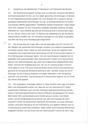 7 5. Verzahnung mit bestehenden IT-Strukturen und Standards des Bundes (1) Der Bundesrechnungshof vermag nicht zu erkennen, inwieweit das BKAmt die Zusammenarbeit mit den von ihm selbst genannten Einrichtungen im Bereich IT und Digitalisierung bereits geklärt hat. Zum Beispiel mit in jüngerer Zeit ge- gründeten behördlichen Einrichtungen wie der im Bundesministerium für Arbeit- und Soziales (BMAS) gegründeten "Denkfabrik Digitale Arbeitswelt". Diese setzen nach ihren Angaben für ihre innovativen Aufgaben ebenfa_lls moderne und agile Methoden ein. Auch bereitet das BMI die Einrichtung einer E-Government-Agen- tur vor, die als „Think & Do Tank" im Rahmen der Digitalisierung der Bundesver- waltung Raum schaffen soll; um innovative Lösungen für den Staat zu gestalten. Das BMI hat hierzu eine Projektgruppe eingerichtet. (2) Der Antrag lässt die Frage offen, wie die Aktivitäten der DTT sinnvoll mit der Tätigkeit der genannten Einrichtungen verzahnt und mögliche· Doppelarbeiten vermieden werden sollen. Dabei ist nicht erkennbar, ob Sie als mögliche Hand- lungsoption eine organisatorische Verknüpfung mit der E-Government-Agentur in Ihre Überlegungen einbezogen haben. Von den beschriebenen Aufgaben her ist- jedenfalls nicht auszuschließen, dass 4Germany/DTT GmbH und E-Government- Agentur sich überschneidende, ggf. aber auch ergänzende Aufgabenfelder bear- beiten. Kernziel der Projektgruppe bzw. der von ihr.aufzubauenden E-Govern- ment-Agentur ist es, Teil eines entsprechenden strukturierten Innovationsmana- gements für die gesamte Bundesverwaltung zu sein. Darüber hinaus soll sie Er- fahrungen bei der Nutzung moderner und agiler Methoden in der Verwaltung sammeln und verbreiten. Die Gründung der E-Government-Agentur ist zum Ende des Jahres 2020 geplant. (3) Die vorgelegten Unterlagen bleiben in vielen Punkten sehr vage und lassen offen, wie sichergestellt werden soll, dass die von der 4Germany/DTT GmbH angewandten Methoden auch von den bisherigen Softwareentwicklungs-Dienst- leistern Informationstechnikzentrum Bund (ITZBund), Bundesagentur für Arbeit, BWI-GmbH, BVA und Bundesdruckerei GmbH genutzt werden. Auch bleibt - unklar, wie die Bundesregierung erreichen will, dass die Produkte der 4Ger- man-y/DTT GmbH mit bestehenden Standards harmonieren. Es muss verhindert _werden, dass beim Übergang· von der Entwicklung zum späteren Betrieb und zur Fortentwicklung Hindernisse entstehen. Dabei sollten auch frühzeitig Maßnahmen angedacht werden, wie das Know-how der 4Germany/DTT GmbH bei ein·er mög-