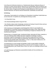 In den Museen der Smithsonian Institution (u.a. Naturhistorisches Museum, Smithsonian Museum of American Art, African American Museum, Museum für Luft- und Raumfahrt, African Art Museum, Freer and Sackler Gallery, Historisches Museum, American Indian Museum sowie National Zoo) ist der Eintritt frei. Mit der Library of Congress besitzt Washington die größte Bibliothek der Welt. Es gibt viele öffentliche Büchereien. Die Stadt hat zahlreiche Baudenkmäler, Gedenkstätten und schöne Parks. b) Kleidung i) Man trägt am Tag die gleiche Art von Kleidung wie in Deutschland, im beruflichen Umfeld kleidet man sich eher konservativ. Es empfiehlt sich, auf klimagerechte Kleidung zu achten. l. Am Tage dunkler Anzug. 2. Bei Abendveranstaltungen dunkler Anzug oder Frack. 3. Bei offiziellen Anlässen dunkle Abendanzüge, manchmal auch Smoking (Tuxedo) für Herren und kurze und lange Abendkleider, aber hauptsächlich Kostüme, für Damen. ii) Bei Ausnutzung von Sonderangeboten sind Kleidungsstücke mittlerer bis guter Qualität etwas preisgünstiger als in Deutschland. Deutsche Winterkleidung kann getragen werden. Wegen der ständig wechselnden Temperaturen wird amerikanische Winterkleidung vorwiegend aus leichterem Woll- und Kunstfasermaterial hergestellt. Schuhwerk kann vor Ort gekauft werden. Amerikanische Schuhe, insbesondere für Damen, entsprechen in Form und Verarbeitung (selten Fußbett) nicht immer europäischen Vorstellungen. Es gibt ein hinreichendes Angebot an Importschuhen für Damen und Herren (entsprechend teuer). Deutsche Kinderschuhe sind i.d.R. besser (Fußbett) und ansprechender. Sportschuhe aller Art gibt es in großer Auswahl und guter Qualität (Adidas, Nike, Reebok, L.A. Gear, L.L. Bean, Sports Authority usw.). Die hiesigen Schuhgrößen entsprechen nicht den deutschen. iii) Kinderkleidung ist in allen Preislagen und Qualitäten in großer Auswahl erhältlich. Kleidung für heranwachsende Kinder (Teenager) liegt preislich nur wenig unter der für Erwachsene. An Sport- und Freizeitkleidung (Shorts, Jeans, Hemden, Blusen, Pullover usw.) gibt es ein reichhaltiges Sortiment in allen Preislagen. : iv) Es gibt Reinigungen und Wäschereien unterschiedlicher Qualität, die Preise sind höher als in Deutschland. 12