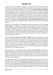 HR(2023) 153 assessment mission was conducted to Ethiopia, in the context of 2022 cessation of hostilities agreement. The first implementation report on the EU approach to cultural heritage in conflicts and crises was presented. The EU continued to be very active on conflict prevention and mediation. The first Annual Report on EU Peace Mediation was prepared while the EU engaged in mediation and dialogue support actions in more than 20 peace processes across the world, and continued assessing conflict risks. It also consolidated peace partnerships on conflict prevention and mediation with the UN and the OSCE and established new ones with the AU and ECOWAS. Joint Progress Reports were presented on Climate Change, Defence and Security and on the Joint Communication on EU strategic approach in support of Disarmament, Demobilisation, and Reintegration of former combatants. The Secretariat of the Partnership for Security and Stability in the Sahel continued its work on strengthening the capabilities of the G5 Sahel states’ armed forces and the Sahel Coalition. 2022 was the last full calendar year to implement the remaining commitments of the first Civilian CSDP Compact. All Member States continued this effort, leading to increased contributions to civilian CSDP missions, where the representation of women increased from 24% to 28% in 2022. The EEAS has developed so-called mini-concepts to allow civilian CSDP missions to better address non-traditional security challenges and a working arrangement between Frontex and EUCAP Sahel Niger was signed in July 2022. In 2023, Member States, the EEAS and the Commission entered the final phase of the new Civilian CSDP Compact, adopted during FAC in May 2023, fulfilling a key task from the Strategic Compass. In 2022, the Civilian Planning and Conduct Capability underwent a comprehensive reform process in order to improve its role and capacity to command and control civilian CSDP missions and enhance the civilian CSDP contribution to EU foreign policy capability. The reform process reinforced CPCC’s operational, coordination and expert capacities. This will allow civilian CSDP to step up its contribution to security sector reforms and crisis management around the world. The reform is the first step towards building a real civilian headquarters, which will be capable of ensuring fast deployment of missions, in line with the Strategic Compass objective of deploying 200 staff in 30 days in complex environments. Important advances have been made when it comes to space security and defence. In March 2023, the High Representative and the Commission adopted the first EU Space Strategy for Security and Defence. It will allow the EU to protect its space assets, defend its interests, deter hostile activities in space and strengthen its strategic posture and autonomy. The work of the EU Satellite Centre has gained renewed importance in the context of Russia’s aggression against Ukraine, including by providing geo-spatial intelligence. The implementation of the 2020 Joint Cybersecurity Strategy progressed well, with the objective to increase resilience and show leadership in cyberspace and strengthen capacities to prevent, deter and respond to cyber-attacks. The Cyber Diplomacy Toolbox has seen multiple applications while the work to revise its implementing guidelines continued. The EEAS hosted the second like-minded exercise on cyber deterrence and policy responses and strengthened partnerships, including through its cyber capacity building efforts. The High Representative and the European Commission HR(2023) 153 37