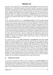 HR(2023) 153 presented a Joint Communication on the EU Policy on Cyber Defence in November 2022, thus completing the EU’s full-spectrum approach to prevention, deterrence and response to malicious cyber activities and cyber threat actors. It enables further investments in modern and interoperable armed forces and technologies, enhances existing partnerships and allows the EU to build cyber defence capabilities and strengthen shared situational awareness. The EEAS advanced work to make the EU better able to detect, prevent and respond to hybrid threats. By the end of 2022, the EU Hybrid Toolbox was established to bring together all the relevant internal and external tools for responding and countering hybrid threats and campaigns in a more coordinated and coherent manner. The EU continued to reinforce its role in countering terrorism (CT) and preventing/countering violent extremism (P/CVE). It did so as a donor of capacity-building projects around the world and as a norm setter, promoting a rights-based and whole-of-society approach to CT-P/CVE within the multilateral structures. This included coordinating a joint EU position in the biannual review of the UN Global Counterterrorism Strategy, which is expected to be finalised by mid/late-June 2023. The EU worked closely with third countries and international organisations, including through dedicated Counter Terrorism Dialogues and cooperation on the ground, facilitated also through its Network of Counterterrorism/Security Experts deployed in 20 EU Delegations. In September 2022, the EU took over the co-chair of the Global Counterterrorism Forum (GCTF), steering the work of the Forum in line with its mandate and the EU’s vision for a rights-based and comprehensive approach, first alongside Morocco and since March 2023 together with Egypt. The EU also continued to actively participate in meetings of the Global Coalition against Da’esh, sharing its experience and coordinating on stabilisation efforts. The increasing strain on the global disarmament, non-proliferation and arms control architecture was further amplified in 2022 in the wake of the Russian war of aggression against Ukraine. EU efforts throughout the year focussed on upholding and strengthening the relevant multilateral instruments and institutions, including through strong positions at notably the 10th Review Conference of the Nuclear Non-Proliferation Treaty, the 77th UN General Assembly, and the 9th Review Conference of the Biological and Toxin Weapons Convention. On 21 March 2022, the Council adopted Conclusions on the Ninth Review Conference of the Biological Weapons Convention. In 2022, the EU also launched a review process of Common Position 2008/944 defining common rules governing control of exports of military technology and equipment. The EU continued to provide significant political and financial support in 2022, including through 8 dedicated new CFSP Council Decisions on projects for an accumulated value of EUR 25,4 million in support of its non-proliferation, disarmament and arms export control priorities. (4) PRIORITIES FOR 2023 It is in the EU’s shared interest to deliver on the EU perspective of the Western Balkans. This should include advancing in accession negotiations with Albania, Montenegro, North Macedonia and Serbia based on the implementation of EU-related commitments; encouraging full alignment with CFSP, including on positions and restrictive measures taken following the Russian aggression against Ukraine, implementing the Agreement on the Path to Normalization between Kosovo and HR(2023) 153 38