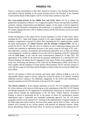 HR(2023) 153 Forum in Almaty (Kazakhstan) in May 2023, chaired by Executive Vice-President Dombrovskis, and political relations building on the second meeting between the President of the European Council and the Heads of State leaders of all five Central Asian countries in June 2023. Our cross-cutting priority in the Middle East and North Africa will be to address the geopolitical consequences of Russia’s war of aggression against Ukraine and especially its political, economic, strategic communication and diplomatic impacts. As the region is heavily targeted by Russian foreign information manipulation and interference, it is important to demonstrate that the EU remains engaged and active with its Southern partners and the Gulf and does not shy away from its responsibilities. Further developments in this regard will be of great importance in terms of other actors’ policy, including the EU’s. Apart from helping countries in the region mitigate these existential issues, building a comprehensive regional EU policy, fully integrating the EU’s global priorities, notably the green deal/transition, the Global Gateway and the Strategic Compass/CSDP, will be a priority for the EU. The EU shall also strive to reinforce its role in addressing ongoing crises and conflicts and contribute to stabilisation processes in the region, using the full range of EU tools – from diplomatic, economic, development and humanitarian approaches up to civilian and military crisis management. Another key emphasis of our work will lie in deepening of the EU’s partnership with the Gulf States, in line with the Joint Communication adopted on 18 May 2022. The appointment of the EUSR for the Gulf and the proposed establishment of a structured EU-GCC Security Dialogue will enhance the EU engagement in the region. Further action regarding a review of the role, functioning and efficiency of the Union for the Mediterranean (UfM) will be done in 2023, together with the Jordanian Co-Chair and the UfM Secretariat. The EU will also continue its work with the League of Arab States and the Kingdom of Saudi Arabia for reviving the Middle East peace efforts. The EU will continue to follow the domestic and human rights situation in Iran as well as its unacceptable military support to Russia, taking into account all options at its disposal, including additional restrictive measures. The diplomatic engagement on the JCPoA and contributing to regional cooperation in the Gulf will remain at the top of the EU’s agenda. The African continent is of key strategic importance to the EU. We will strengthen and deepen EU-Africa relations, with a focus on following up on the commitments of the 2022 AU-EU Summit and through deepening AU-EU engagement on multilateralism. Delivering on concrete projects of mutual interest through the implementation of the EU-Africa “Global Gateway” Investment Package is critical to positioning the EU as the partner of choice for transformative projects implemented under a responsible and sustainable partnership approach. The EU will pursue geographic priorities on the regional level - focusing on the implementation of regional strategies on the Sahel region and coastal countries, the Great Lakes region, and the Horn of Africa - and on the bilateral level, focusing on key African partners with potential for deepened relations: Ghana, Kenya, Mozambique, Nigeria and South Africa. To increase our footprint on the continent, the EU HR(2023) 153 40