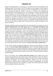 HR(2023) 153 interest in revitalising relations, to set the stage for a successful summit and to make progress on the pending agreements with the region. ‘The EU will continue its active support to the peace process in Colombia in the context of the “Total Peace” initiative of President Petro, as well as efforts to bring a peaceful and democratic solution to the crisis in Venezuela, while addressing the humanitarian fall-out and the migration crisis. The reinvigoration of relations with Brazil should allow the holding of an EU-Brazil Summit at the end of 2023 or in early 2024. The EU will continue efforts to advance towards the finalisation of the modernisation of the EU-Mexico Global Agreement, to successfully conclude the negotiations related to the EU-Mercosur Agreement and to accelerate the signature and ratification of the EU-Chile Advanced Framework Agreement. Executive Vice-President Timmermans is expected to visit Barbados, Guyana and Suriname in June 2023. The EU will continue to support efforts to promote democracy, stability and dialogue in Peru, Ecuador and Bolivia. Regarding multilateral relations, three priorities have been identified in the coming year. First, to accelerate implementation of the 2030 Agenda and its 17 Sustainable Development Goals (SDGs). A key occasion for this will be the SDG Summit, to be held in New York on 18 September 2023. The EU will work collectively to ensure a successful outcome covering important issues including ‘financing for development’, reform of the multilateral development banks and the UN development system, as well as effective action on climate change, biodiversity and global health. Second, the EU will contribute to efforts to strengthen global governance through ‘Our Common Agenda’. This will involve work on initiatives such as the ‘New Agenda for Peace’, the ‘Global Digital Compact’, the ‘Emergency Platform’, and the report of the High-Level Advisory Board, making a strong connection from the SDG Summit to the Summit of the Future due to be held in 2024. Third, the EU is committed to renewing and building its partnerships with the whole of the UN membership, including those countries most affected by climate change. This will involve more active and sustained outreach to partner countries to promote truly inclusive multilateralism. The EU will also continue its multifaceted engagement in other areas at the multilateral level. When it comes to supporting human rights and democracy, the EU will further strengthen its human rights and democracy action under the 2020-2024 Action Plan on Human Rights and Democracy and continue developing a Framework for Business and Human Rights to ensure strong coherence of our policies on responsible business conduct, in line with the UN Guiding Principles on Business and Human Rights. The EU will continue with its electoral observation activities where conditions allow and if invited by national authorities with possible missions under consideration in Liberia, the Maldives, Zimbabwe, Bangladesh and the Democratic Republic of Congo. The EU remains committed to supporting and engaging with government authorities, political actors and civil society organisations of partner countries to implement the missions’ recommendations. In this light, Electoral Follow-up Missions will be organised in countries where Election Observation Missions have been deployed in the last couple of year. HR(2023) 153 42