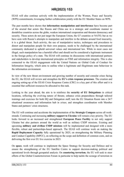HR(2023) 153 EEAS will also continue actively with the implementation of the Women, Peace and Security (WPS) commitments, leveraging further collaboration jointly with the EU Member States on WPS. The past months have shown that information manipulation and interference have become part of the arsenal that actors like Russia and China use in a strategic and coordinate manner to destabilise countries across the globe, weaken international cooperation and threaten democracy and security. These actors do not just target the European Union, the G7 countries or NATO, but as we have seen with Russia’s attempts to manipulate and interfere in the debates around food insecurity, it is a global threat. Such activity, the use of manipulative tactics, techniques and procedures to distort and manipulate people for their own purpose, needs to be challenged by the international community dedicated to uphold universal values and international law. While in most cases not illegal, such manipulation has a harmful effect and should not be considered a legitimate instrument in the foreign policy of a state. The EEAS will continue its discussions with international partners and stakeholders to develop international principles on FIMI and information integrity. This is also connected to the EEAS engagement with the United Nations on Global Code of Conduct for Information Integrity, which aims to outline what is legitimate and illegitimate state behaviour in the information environment. In view of the new threat environment and growing number of security and consular crises facing the EU, the EEAS will review and strengthen the EU’s crisis response processes. The creation and ongoing setting-up of the EEAS Crisis Response Centre (CRC) is a key part of this effort and it is essential that sufficient resources be allocated to this task. Looking to the year ahead, the aim is to reinforce the security of EU Delegations in critical locations, reflecting the evolving nature of threats; enhance crisis preparedness through tailored trainings and exercises for both HQ and Delegation staff; turn the EU Situation Room into a 24/7 situational awareness and information hub in crises; and strengthen coordination with Member States and partners’ crisis structures. The EU will continue and accelerate the implementation of the Strategic Compass across all work- strands. Continuing and increasing military support to Ukraine will remain a key priority. The EU looks forward to an increased and strengthened European Peace Facility to not only support Ukraine but also partners around the world as well as military CSDP missions. Existing and upcoming military and civilian CSDP missions will be implemented and designed with a more flexible, robust and partnerships-based approach. The EEAS will continue work on making the Rapid Deployment Capacity fully operational by 2025, on strengthening the Military Planning and Conduct Capability (MPCC), on reflecting on the scope and definition of common costs, and on delivering the first ever EU live exercise in 2023. On space, work will continue to implement the Space Strategy for Security and Defence and to ensure the strengthening of the EU Satellite Centre to support decision-making political and operational levels through geospatial analysis. On countering terrorism, the EU will seek to steer efforts of the Global Counterterrorism Forum in particular to help tackle the scourge of terrorism in HR(2023) 153 44