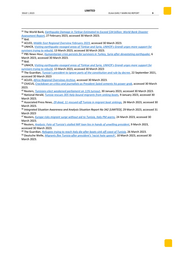 LIMITED SSUE 1, 2023 EUAA EARLY WARN NG REPORT 9 33 The World Bank, Earthquake Damage in Türkiye Estimated to Exceed $34 billion: World Bank Disaster Assessment Report, 27 February 2023, accessed 30 March 2023. 34 Ibid. 35 ACLED, Middle East Regional Overview February 2023, accessed 30 March 2023. 36 UNHCR, Visiting earthquake-ravaged areas of Türkiye and Syria, UNHCR’s Grandi urges more support for survivors trying to rebuild, 13 March 2023, accessed 30 March 2023. 37 PBS News Hour, Humanitarian crisis persists for survivors in Turkey, Syria after devastating earthquake, 6 March 2023, accessed 30 March 2023. 38 Ibid. 39 UNHCR, Visiting earthquake-ravaged areas of Türkiye and Syria, UNHCR’s Grandi urges more support for survivors trying to rebuild, 13 March 2023, accessed 30 March 2023 40 The Guardian, Tunisia’s president to ignore parts of the constitution and rule by decree, 22 September 2021, accessed 30 March 2023 41 ACLED, Africa Regional Overviews Archive, accessed 30 March 2023. 42 CIVICUS, Crackdown on critics and journalists as President Saied cements his power grab, accessed 30 March 2023. 43 Reuters, Tunisians elect weakened parliament on 11% turnout, 30 January 2023, accessed 30 March 2023. 44 National Herald, Tunisia rescues 305 Italy-bound migrants from sinking boats, 9 January 2023, accessed 30 March 2023. 45 Associated Press News, 29 dead, 11 rescued off Tunisia in migrant boat sinkings, 26 March 2023, accessed 30 March 2023. 46 Integrated Situation Awareness and Analysis Situation Report No 342 [LIMITED], 29 March 2023, accessed 31 March 2023 47 Reuters, Europe risks migrant surge without aid to Tunisia, Italy PM warns, 24 March 2023, accessed 30 March 2023. 48 Reuters, Analysis: Fate of Tunisia's stalled IMF loan lies in hands of unwilling president, 9 March 2023, accessed 30 March 2023. 49 The Guardian, Refugees trying to reach Italy die after boats sink off coast of Tunisia, 26 March 2023. 50 Deutsche Welle, Migrants flee Tunisia after president's 'racist hate speech', 10 March 2023, accessed 30 March 2023.