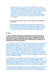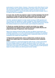 purely based on private initiative. However, if discussions within Work Strand 3 show that a European set of rules/recommendations may seem useful for the latter group, this should not be applied for ships carrying out search and rescue services on governmental behalf. For rescue units acting under governmental mandate, there is no need for them to be regulated. 8. In your view, are there any aspects or gaps in existing legislation that should be looked at to make sure that private vessels could carry out SAR as their predominant activity in a safe and orderly manner? If yes, provide details. Currently, operational aspects for private vessels carrying out SAR operations are only covered by the regulations on safety management. More detailed provisions or guidance taking into account the specific operation, especially when persons rescued from distress situations are carried on board, could increase the safety level. 9. Would you consider that there is a need for any further (e.g. safety) requirements to be applied to these vessels that would enable effective and proportionate type of inspections, when necessary? Most of the vessels are flying EU flags, but there are different requirements and certification processes. In our view it could be beneficial to develop an EU guidance to the flag states to ensure such vessels provide an appropriate safety level and be accepted by port States and coastal States. 10. Beyond this questionnaire, and in a medium-term, would you see any specific and related topics for a dedicated (comparative and/or analytical) study? If there is support for a harmonized approach within the EU, a study could analyse the actual hazards related to the specific operational profile of such ships (e.g. following the IMO formal safety approach) to identify suitable risk control options that could serve as the basis for an EU guidance on vessels carrying out SAR operations based on private initiative and without governmental mandate.