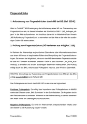 1/1 Fingerabdrücke 1. Anforderung von Fingerabdrücken durch MS bei DZ [Ref. 32D-F] Geht im DubliNET MS-Posteingang die Aufforderung eines MS zur Übersendung von Fingerabdrücken ein, ist dieses Schreiben als Schriftstück D0611 „MS_Anfragen_all- gem“ in die Akte aufzunehmen. Im Anschluss daran ist im Aktenbetreff der Hinweis „MS Aufforderung Fingerabdrücke“ zu vermerken und die Akte an die oder den zustän- digen Dublin-SB weiterzuleiten. 2. Prüfung von Fingerabdrücken (DÜ-Verfahren aus MS) [Ref. 32B] Im Rahmen der Aktenanlage aufgrund eines Übernahme- oder Informationsersuchens aus einem MS muss in begründeten Fällen eine Überprüfung der Fingerabdrücke er- folgen. Es besteht die Möglichkeit, die durch den MS übermittelten Fingerabdruckblät- ter oder NST-Dateien auswerten zulassen. Dafür ist das Dokument „Anf_FABl_Aus- wertung“ zu erstellen und an den zuständigen Bearbeiter weiterzuleiten. Die Prüfung erfolgt durch das BKA, welches das Prüfergebnis nach ca. zwei Wochen übermittelt. WICHTIG: Die Anfrage zur Auswertung von Fingerabdrücken (von MS) an das BKA erfolgt ausschließlich durch Referat 32B Das Prüfergebnis wird durch den BSB-VSD in der Akte wie folgt erfasst: Positives Prüfergebnis: Es erfolgt das Importieren des Prüfergebnisses in MARiS sowie das Erfassen unter „BKA Schreiben“ in den Schriftstücken. Die Angaben sind in den Personendaten zu erfassen. Weiterhin ist die Referenzierung zu bereits bestehen- den Akten sowie ein Datenabgleich durchzuführen. Negatives Prüfergebnis: Es wird ein Aktenvermerk entsprechenden Inhalts unter dem Betreff „FABl-Auswertung negativ“ erstellt. Fingerabdrücke Stand 11/2020