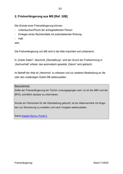 2/2 2. Fristverlängerung aus MS [Ref. 32B] Die Gründe einer Fristverlängerung können - Untertauchen/Flucht der antragstellenden Person - Einlegen eines Rechtsmittels mit aufschiebender Wirkung - Haft sein. Die Fristverlängerung von MS wird in die Akte importiert und umbenannt. In „Dublin Daten“, Abschnitt „Überstellung“, wird der Grund der Fristhemmung in „Sachverhalt“ erfasst, das automatisch gesetzte „Datum“ wird gelöscht. Im Betreff der Akte ist „Hemmnis“ zu erfassen und zur weiteren Bearbeitung an die oder den zuständigen Dublin-SB weiterzuleiten Besonderheit: Sollte der Fristverlängerung ein Termin vorausgegangen sein, so ist die ABH und die BPOL schriftlich darüber zu informieren. Wurde ein Fahrschein für die Überstellung gebucht, ist ein Aktenvermerk mit Anga- ben zur Stornierung zu erstellen und nach Vorgabe weiterzuleiten. Siehe Kapitel Storno, Punkt 2. Fristverlängerung Stand 11/2020