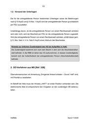 3/3 1.2. Versand der Unterlagen Die für die antragstellende Person bestimmten Unterlagen sowie die Belehrungen nach § 10 AsylG und § 14 Abs. 1 AsylG sind der antragstellenden Person grundsätzlich per PZU zuzustellen. Unabhängig davon, ob die antragstellende Person von einem Rechtsanwalt vertreten wird oder nicht, wird der Bescheid per PZU an die antragstellende Person zugestellt. Wird die antragstellende Person von einem Rechtsanwalt vertreten, erhält dieser gem. § 31 Abs. Satz 4 i.V.m. Satz 6 AsylG einen Abdruck des Bescheides. Hinweis zur örtlichen Zuständigkeit des VG bei Aufgriffen in Haft: Die Zuständigkeit bestimmt sich nach dem Bezirk in dem sich die Abschiebehaftan- stalt befindet. In die RBB ist daher das VG aufzunehmen, in dessen Zuständigkeits- bereich sich der Aufenthaltsort der antragstellenden Person (Abschiebehaftanstalt) befindet. 2. DÜ-Verfahren aus MS [Ref. 32B] Übernahmeersuchen mit Anmerkung „Dringende Antwort erbeten – Grund: Haft“ sind, mit Priorität zu bearbeiten. Im Betreff der Akte muss der Hinweis „HAFT“ an erster Position vorhanden sein. Die elektronische Akte ist entsprechend den Vorgaben an den zuständigen SB weiterzu- leiten. Haftfälle Stand 11/2020