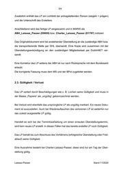 3/4 Zusätzlich enthält das LP ein Lichtbild der antragstellenden Person (siegeln + prägen) und die Unterschrift des Erstellers. Anschließend wird das fertige LP eingescannt und in MARiS als ABH_Laissez_Passer (D0609) bzw. Charter_Laissez_Passer (D1797) indiziert. Das Originaldokument wird bei anstehender Überstellung an die zuständige ABH bzw. die transportierende Stelle per DHL übersandt. Eine Kopie wird zusammen mit der Überstellungsankündigung an den zuständigen Mitgliedsstaat per DublinNET ver- sandt. Eine Korrektur des LP seitens der ABH ist nur nach Rücksprache mit dem Bundesamt erlaubt. Die korrigierte Fassung muss dem MS und der BPol zugeleitet werden. 2.3. Gültigkeit / Verlust Das LP verliert durch Beschädigungen wie z. B. Lochen seine Gültigkeit und muss in der Maske „Papiere“ als „ungültig“ gekennzeichnet werden. Bei Verlust wird ebenfalls das ursprüngliche LP als ungültig markiert. Ein neues Doku- ment ist auszustellen. Auch bei Wiederauftauchen des verlorenen LP ist weiterhin nur das zuletzt ausgestellte LP gültig. Handelt es sich bei der Terminbearbeitung um einen erneuten Überstellungstermin, wird kein neues LP erstellt. In diesen Fällen hat das bereits erstellte LP noch Gültigkeit. Das LP behält bis zum Abschluss des Verfahrens (erfolgreiche Überstellung oder Frist- ablauf) seine Gültigkeit. Eine Ausnahme besteht bei Charter-Laissez-Passer; diese sind nur am Tag der Über- stellung gültig. Laissez-Passer Stand 11/2020