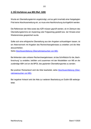 2/2 2. DÜ-Verfahren aus MS [Ref. 32B] Wurde ein Überstellungstermin angekündigt, und es geht innerhalb einer festgelegten Frist keine Abschlussmeldung ein, so muss eine Nachforschung durchgeführt werden. Die Referenzen der Akte sowie das AZR müssen geprüft werden, ob im Zeitraum des Überstellungstermins ein Asylantrag oder Folgeantrag gestellt bzw. der Hinweis einer Wiedereinreise gespeichert wurde. Sollte sich eine erfolgreiche Überstellung aus den Angaben schlussfolgern lassen, ist ein Aktenvermerk mit Angaben des Rechercheergebnisses zu erstellen und die Akte abzuschließen. Siehe Abschlussmitteilung (Übernahmeersuchen von MS). Bei fehlenden oder unklaren Rechercheergebnissen, ist das Schriftstück für die „Nach- forschung“ zu erstellen, befüllen und zusammen mit den Modalitäten von MS an die zuständige ABH und an die BPOL des geplanten Überstellungsortes zu senden. Bei positiver Rückantwort wird die Akte bearbeitet, siehe Abschlussmitteilung (Über- nahmeersuchen von MS). Bei negativer Antwort wird die Akte zur weiteren Bearbeitung an Dublin-SB weiterge- leitet. Nachforschung Stand 11/2020