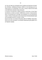 2/2 Am Tag nach Ablauf der Aushangfrist gilt die Zustellung des Bescheids als bewirkt. Das Schriftstück „OeffZuBenachrichtigung“ (D0205) ist nach Beendigung des Aus- hangs händisch zu vervollständigen und zur Akte zu nehmen. Hierbei wird die bereits in der MARiS-Akte vorhandene Version überscannt. Im Anschluss ist der Bescheid in MARiS einzufrieren, auszudrucken, mit dem Datum der Abnahme zu versehen und wieder in MARiS-Akte zu scannen. Im Dokumentenbe- treff ist „mit Aushangvermerk“ einzutragen. Das Zustelldatum ist in der Entscheidungs- maske zu erfassen. Der Bescheid und die entsprechenden Rechtsbehelfsbelehrungen sind als gesiegelte Abschrift an die ABH zu senden. Danach ist die Akte in die Aktivität „Öff.Zust.Bsch.ABH,Info PGB/Bbfa“ weiterzuleiten. Damit wird die Akte automatisch in die Aktivität Fristüberwachung BK geleitet und in der Registratur abgelegt. Öffentliche Zustellung Stand 11/2020