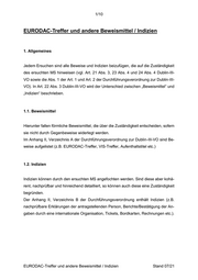 1/10 EURODAC-Treffer und andere Beweismittel / Indizien 1. Allgemeines Jedem Ersuchen sind alle Beweise und Indizien beizufügen, die auf die Zuständigkeit des ersuchten MS hinweisen (vgl. Art. 21 Abs. 3, 23 Abs. 4 und 24 Abs. 4 Dublin-III- VO sowie die Abs. 1 der Art. 1 und Art. 2 der Durchführungsverordnung zur Dublin-III- VO). In Art. 22 Abs. 3 Dublin-III-VO wird der Unterschied zwischen „Beweismittel“ und „Indizien“ beschrieben. 1.1. Beweismittel Hierunter fallen förmliche Beweismittel, die über die Zuständigkeit entscheiden, sofern sie nicht durch Gegenbeweise widerlegt werden. Im Anhang II, Verzeichnis A der Durchführungsverordnung zur Dublin-III-VO sind Be- weise aufgelistet (z.B. EURODAC-Treffer, VIS-Treffer, Aufenthaltstitel etc.) 1.2. Indizien Indizien können durch den ersuchten MS angefochten werden. Sind diese aber kohä- rent, nachprüfbar und hinreichend detailliert, so können auch diese eine Zuständigkeit begründen. Der Anhang II, Verzeichnis B der Durchführungsverordnung enthält Indizien (z.B. nachprüfbare Erklärungen der antragstellenden Person, Berichte/Bestätigung der An- gaben durch eine internationale Organisation, Tickets, Bordkarten, Rechnungen etc.). EURODAC-Treffer und andere Beweismittel / Indizien Stand 07/21