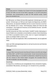 8/10 Hinweis: Bei Ersuchen nach Art. 12 Absätze 2 bis 4 Dublin III-VO ist die Zuständigkeit eines MS mit dem VIS-Treffer und nicht mit den FABl zu begründen. Im Juli 2018 wurde jedoch entschieden, dass ausnahmsweise an Italien die FABl mitschickt werden, obwohl diese nicht erforderlich sind. Die FABl werden vom Referat 32A beim BKA angefordert. Anforderungen sind zu be- gründen. Anforderungen von FABl sind unter Angabe einer Begründung, des MARiS- Aktenzeichens, der deutschen EURODAC-Nummer und der D-Nummer an das Post- fach des Referates 32A zu richten: *32A-Posteingang. Referat 32A fordert die FABl anschließend - unter Angabe der D-Nummer und der EURODAC-Nummer - beim BKA an und führt eine Statistik. Das BKA übersendet das FABl an das Postfach: DubliNET AnsiNist. Maileingänge in diesem Postfach sind zu bearbeiten und anschließend zu löschen. Bei der Bearbeitung von E-Mails ist grundsätzlich darauf zu achten, dass nur in eigener Zuständigkeit lie- gende und erledigte E-Mails zu löschen sind. Referat 32A verteilt die eingehenden FABl an die Mitarbeitenden, die sie angefordert haben. Sofern das FABl zuständigkeitsbegründend ist, darf das Ersuchen erst nach Erhalt des FABls gestellt werden. Hinweis: In diesen Fällen muss das Ersuchen über Microsoft Outlook an den MS unter Anfügen der FABl im NIST- und PDF-Format versandt werden. Da der Versand des Ersuchens nicht über MARiS erfolgt, ist in der MARiS-Schriftstückliste im Betreff des Ersuchens der Text „Versand nur über Outlook möglich“ einzugeben. Die versandte E-Mail an den MS ist ebenfalls in die Akte einzufügen. Anmerkung: Da einige MS zur Identifizierung der antragstellenden Person erforderliche Angaben, einschließlich FABl anfordern, sind diese gem. Art. 34 Dublin-III-VO zu übermitteln. EURODAC-Treffer und andere Beweismittel / Indizien Stand 07/21