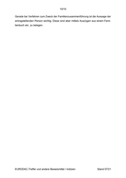 10/10 Gerade bei Verfahren zum Zweck der Familienzusammenführung ist die Aussage der antragstellenden Person wichtig. Diese sind aber mittels Auszügen aus einem Fami- lienbuch etc. zu belegen. EURODAC-Treffer und andere Beweismittel / Indizien Stand 07/21
