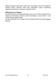 Mappen die gelöscht werden sollen, dürfen nicht an die Ablagen „Archiv“ oder „Registratur“ adressiert werden. Außerdem dürfen keine „Müllmappen“ zwecks Verschiebung überflüssiger Dokumente im Arbeitskorb vorgehalten werden. Weiterleitung von Mappen Grundätzlich gilt, dass eine Mappenweiterleitung immer in den nächsten Workflowschritt zu erfolgen hat. Insbesondere ist darauf zu achten, dass Mappen – und auch Akten – in den richtigen Ablagen abgelegt werden. Eine Übersichtstabelle zu den Ablagen und dem zulässigen Inhalt ist dem Kapitel „Ablagen“ beigefügt. DA-AVS: Mappenbearbeitung 3/3 Stand 03/23