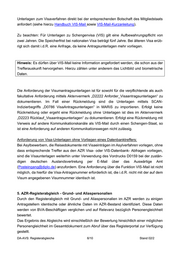 Unterlagen zum Visaverfahren direkt bei der entsprechenden Botschaft des Mitgliedstaats anfordert (siehe hierzu Handbuch VIS-Mail sowie VIS-Mail-Kurzanleitung). Zu beachten: Für Unterlagen zu Schengenvisa (VIS) gilt eine Aufbewahrungspflicht von zwei Jahren. Die Speicherfrist bei nationalen Visa beträgt fünf Jahre. Bei älteren Visa erüb- rigt sich damit i.d.R. eine Anfrage, da keine Antragsunterlagen mehr vorliegen. Hinweis: Es dürfen über VIS-Mail keine Information angefordert werden, die schon aus der Trefferauskunft hervorgehen. Hierzu zählen unter anderem das Lichtbild und biometrische Daten. Die Anforderung der Visumantragsunterlagen ist für sowohl für die verpflichtende als auch fakultative Anforderung mittels Aktenvermerk „D2222 Anforder_Visaantragsunterlagen“ zu dokumentieren. Im Fall einer Rückmeldung sind die Unterlagen mittels SCAN- Indizierbegriffs „D0786 VisaAntragsunterlagen“ in MARiS zu importieren. Erfolgt keine Rückmeldung oder ergeht eine Rückmeldung ohne Unterlagen ist dies im Aktenvermerk „D2223 Rücklauf_Visaantragsunterlagen“ zu dokumentieren. Erfolgt eine Rückmeldung mit Verweis auf andere Kommunikationskanäle als VIS-Mail durch einen Schengen-Staat, so ist eine Anforderung auf anderen Kommunikationswegen nicht zulässig. Anforderung von Visa-Unterlagen ohne Vorliegen eines Datenbanktreffers: Bei Asylbewerbern, die Reisedokumente mit Visaeinträgen im Asylverfahren vorlegen, ohne dass entsprechende Treffer aus den AZR Visa- oder VIS-Datenbank- Abfragen vorliegen, sind die Visaunterlagen weiterhin unter Verwendung des Vordrucks D0159 bei der zustän- digen deutschen Auslandsvertretung per E-Mail über das Auswärtige Amt (Posteingang@diplo.de) anzufordern. Eine Anforderung über die Funktion VIS-Mail ist nicht möglich, da hierfür die Visa-Antragsnummer erforderlich ist, die i.d.R. nicht mit der auf dem Visum angegebenen Visumnummer identisch ist. 5. AZR-Registerabgleich - Grund- und Aliaspersonalien Durch den Registerabgleich mit Grund- und Aliaspersonalien im AZR werden zu einigen Antragstellern identische oder ähnliche Daten im AZR-Bestand identifiziert. Diese Daten werden von BVA-Beschäftigen verglichen und auf Relevanz bezüglich Personengleichheit bewertet. Das Ergebnis des Abgleichs wird einschließlich der Bewertung hinsichtlich einer möglichen Personengleichheit im Gesamtdokument zum Abruf über das Registerportal zur Verfügung gestellt. DA-AVS: Registerabgleiche 6/10 Stand 02/2
