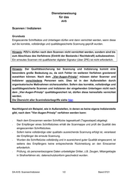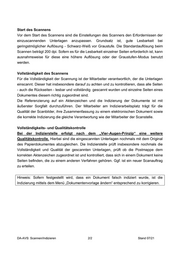 Start des Scannens Vor dem Start des Scannens sind die Einstellungen des Scanners den Erfordernissen der einzuscannenden Unterlagen anzupassen. Grundsatz ist, gute Lesbarkeit bei geringstmöglicher Auflösung - Schwarz-Weiß vor Graustufe. Die Standardauflösung beim Scannen beträgt 200 dpi. Sofern es für die Lesbarkeit einzelner Seiten erforderlich ist, kann ausnahmsweise für diese eine höhere Auflösung oder der Graustufen-Modus benutzt werden. Vollständigkeit des Scannens Für die Vollständigkeit der Scannung ist der Mitarbeiter verantwortlich, der die Unterlagen einscannt. Dieser hat insbesondere darauf zu achten und zu kontrollieren, dass alle Seiten - auch die Rückseiten - lesbar und vollständig gescannt wurden und einzelne Seiten eines Dokumentes diesem richtig zugeordnet sind. Die Referenzierung auf ein Aktenzeichen und die Indizierung der Dokumente ist mit äußerster Sorgfalt durchzuführen. Der Mitarbeiter am Indizierarbeitsplatz trägt für die Qualität der Scanbilder, ihre Zusammenfassung zu einem elektronischen Dokument sowie die korrekte Indizierung die gleiche Verantwortung wie der Mitarbeiter der Scanstelle. Vollständigkeits- und Qualitätskontrolle Bei der Indizierstelle erfolgt nach dem „Vier-Augen-Prinzip“ eine weitere Qualitätskontrolle. Hierbei sind die eingescannten Unterlagen nochmals mit dem Original des Papierdokumentes abzugleichen. Die Indizierstelle prüft insbesondere nochmals die Vollständigkeit und Qualität der gescannten Unterlagen, prüft ob die Postmappe dem korrekten Aktenzeichen zugeordnet ist und kontrolliert, dass sich in einem Dokument keine Seiten befinden, die zu einem anderen Verfahren gehören. Ggf. ist ein neuer Scanauftrag zu erteilen. Hinweis: Sofern festgestellt wird, dass ein Dokument falsch indiziert wurde, ist die Indizierung mittels dem Menü „Dokumentenvorlage ändern“ entsprechend zu korrigieren. DA-AVS: Scannen/Indizieren 2/2 Stand 07/21