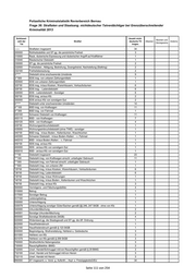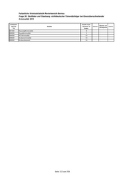 Polizeiliche Kriminalstatistik Revierbereich Bernau Frage 36: Straftaten und Staatsang. nichtdeutscher Tatverdächtiger bei Grenzüberschreitender Kriminalität 2013 Schlüssel- Anzahl nicht- Bosnien und zahl der Straftat deutsche TV Albanien Andorra Herzegowina Tat insges. ------ Straftaten insgesamt 34 200000 Rohheitsdelikte und ST gg. die persönliche Freiheit 3 210000 Raub, räuberische Erpressung und räuberischer Angriff auf Kraftfahrer 1 210040 Räuberischer Diebstahl 1 230000 ST gg. die persönliche Freiheit 2 232000 Freiheitsber., Nötigung, Bedrohung, Zwangsheirat, Nachstellung (Stalking) 2 232100 Freiheitsberaubung 2 3***** Diebstahl ohne erschwerende Umstände 9 3**500 EDS insg. von unbaren Zahlungsmitteln 1 300500 EDS von unbaren Zahlungsmitteln 1 325*00 EDS insg. in/aus Kiosken, Warenhäusern, Verkaufsräumen 6 326*00 EDS insg. - Ladendiebstahl 6 326000 EDS - Ladendiebstahl - Sonstiger 6 350*00 EDS insg. an/aus Kfz 2 350000 EDS an/aus Kfz von sonstigem Gut 2 4***** Diebstahl unter erschwerenden Umständen 14 4**100 BSD insg. von Kraftwagen 11 4**300 BSD insg. von Fahrrad 1 400100 Schwerer Diebstahl von Kraftwagen 11 400110 BSD - von Kraftwagen 7 400120 SDS - von Kraftwagen 4 435*00 Wohnungseinbruchdiebstahl 1 435000 Wohnungseinbruchdiebstahl (ohne TWE) - sonstiger 1 440*00 BSD insg. in/aus Boden-, Kellerräumen, Waschküchen 1 440300 Schwerer Diebstahl - in/aus Boden-/Kellerr. - v. Fahrrad 1 440310 BSD - in/aus Boden-/Kellerr. - v. Fahrrad 1 450*00 SDS insg. an/aus Kfz 1 450000 SDS - an/aus Kfz von sonstigem Gut 1 450010 BSD - an/aus Kfz von sonstigem Gut 1 ****00 Diebstahl insgesamt 23 ***100 Diebstahl insg. von Kraftwagen einschl. unbefugter Gebrauch 11 ***300 Diebstahl insg. von Fahrrad einschl. unbefugter Gebrauch 1 ***500 Diebstahl insg. von unbaren ZM 1 *25*00 Diebstahl insg. in/aus Kiosken, Warenhäusern, Verkaufsräumen 6 *26*00 Diebstahl insg. Ladendiebstahl 6 *35*00 Diebstahl insg. in/aus Wohnungen 1 *40*00 Diebstahl insg. in/aus Boden-, Kellerräumen und Waschküchen 1 *50*00 Diebstahl insg. an/aus Kfz 3 500000 Vermögens- und Fälschungsdelikte 4 510000 Betrug 1 517000 Sonstiger Betrug 1 517100 Leistungsbetrug 1 530000 Unterschlagung 1 530079 Unterschlagung sonstiger Güter/Sachen gemäß §§ 246, 247 StGB - ohne von Kfz 1 540000 Urkundenfälschung 2 540001 Sonstige Urkundenfälschung 2 600000 Sonstige Straftatbestände (StGB) 4 620000 Widerstand gg. die Staatsgewalt und ST gg. die öff. Ordnung 1 622000 Hausfriedensbruch 1 622100 Hausfriedensbruch gemäß § 123 StGB 1 630000 Begünstigung, Strafvereitelung, Hehlerei u. Geldwäsche 3 631000 Hehlerei von Kfz 3 631079 Hehlerei von Kfz gemäß § 259 StGB 3 700000 Strafrechtliche Nebengesetze 3 730000 Rauschgiftdelikte -BtMG- 3 732000 Unerl. Handel/Schmuggel mit/von Rauschgiften gemäß § 29 BtMG 3 732100 Unerl. Handel und Schmuggel mit/von Heroin 3 732110 Unerl. Handel mit Heroin 3 890000 ST insgesamt, o. Verst. g. Aufenth.-, Asyl- u. FreizügigkeitsG/EU 34 Seite 111 von 254