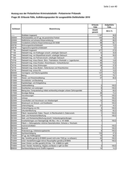 Seite 1 von 40 Auszug aus der Polizeilichen Kriminalstatistik - Polizeirevier Pritzwalk Frage 20: Erfasste Fälle, Aufklärungsquoten für ausgewählte Deliktsfelder 2016 Erfasste Aufgeklärte Fälle Fälle Schlüssel Bezeichnung Anzahl AQ in % gesamt ------ Straftaten insgesamt 1.197 56,8 200000 Rohheitsdelikte und ST gg. die persönliche Freiheit 184 90,2 222000 Gefährliche und schwere Körperverletzung 26 88,5 224000 Vorsätzliche einfache Körperverletzung § 223 StGB 89 92,1 435*00 Wohnungseinbruchdiebstahl 16 12,5 436*00 Tageswohnungseinbruchdiebstahl 6 0,0 ****00 Diebstahl insgesamt 477 27,0 ***100 Diebstahl insg. von Kraftwagen einschl. unbefugter Gebrauch 13 30,8 ***200 Diebstahl insg. von Moped/Krad einschl. unbefugte Gebrauch 8 50,0 ***300 Diebstahl insg. von Fahrrad einschl. unbefugter Gebrauch 46 2,2 *10*00 Diebstahl insg. in/aus Dienst-, Büro-, Fabrikations-,Werkstatt- u. Lagerräumen 48 14,6 *25*00 Diebstahl insg. in/aus Kiosken, Warenhäusern, Verkaufsräumen 95 72,6 *35*00 Diebstahl insg. in/aus Wohnungen 29 37,9 *40*00 Diebstahl insg. in/aus Boden-, Kellerräumen und Waschküchen 9 22,2 *50*00 Diebstahl insg. an/aus Kfz 57 10,5 500000 Vermögens- und Fälschungsdelikte 147 75,5 510000 Betrug 91 79,1 511000 Waren- und Warenkreditbetrug 47 80,9 512000 Grundstücks- und Baubetrug 513000 Kapitalanlage- und Anlagebetrug 514000 Geldkreditbetrug 2 100,0 515000 Erschleichen von Leistungen 8 100,0 516000 Betrug bzw. Computerbetrug mittels rechtswidrig erlangter unbarer Zahlungsmittel 5 60,0 517000 Sonstiger Betrug 29 72,4 520000 Veruntreuungen 15 100,0 521000 Untreue 1 100,0 522000 Vorenthalten und Veruntreuen von Arbeitsentgelt 13 100,0 523000 Missbrauch von Scheck- und Kreditkarten 1 100,0 530000 Unterschlagung 27 44,4 531000 Unterschlagung von Kfz 3 100,0 540000 Urkundenfälschung 12 83,3 543000 Fälsch. beweiserhebl. Daten, Täusch. im Rechtsverkehr b. Datenverarb. 1 100,0 550000 Geld- und Wertzeichenfälschung 1 100,0 551000 Geld- und Wertzeichenfälschung einschl. Vorbereitungshandlungen 552000 Inverkehrbringen von Falschgeld §§ 146 Abs. 1 Nr. 3, 147 StGB 1 100,0 553000 Fälsch. v. Zahlungskarten mit/ohne Garantiefunktion, Schecks u. Wechseln 560000 Insolvenzstraftaten 1 100,0 561000 Bankrott 1 100,0 621020 Widerstand gg. Vollstreckungsbeamte 9 100,0 674000 Sachbeschädigung 132 37,9 726200 ST gg. das Waffengesetz 10 80,0 731000 Allg. Verstöße gemäß § 29 BtMG (soweit nicht unter 7340 pp. zu erfassen) 43 100,0 732000 Unerl. Handel/Schmuggel mit/von Rauschgiften gemäß § 29 BtMG 9 100,0 733000 Unerl. Einfuhr von Btm gemäß § 30 Abs. 1 Nr. 4 BtMG (in ngM) 734800 Unerl. Handel, Herstellung, Abgabe und Besitz in ngM von Btm 3 100,0 899500 Sachbeschädigung durch Graffiti insgesamt 14 14,3