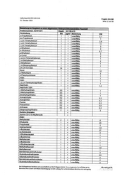 Laborbericht E310133 “Projekt 231150 31. Oktober 2023 Seite 4 von 56 1 Ortsbegehung Da die Ortsbegehung vom Auftraggeber durchgeführt wurde, wird auf entsprechende Informationen und den Bericht des Auftraggebers verwiesen. 2 Raumluftprobe: flüchtige organische Verbindungen Mit dieser Probenahme werden flüchtige organische Verbindungen nach den Angaben des UBA (Umweltbundesamt) und der Norm DIN ISO 16000-6:2022-03 erfasst. Hierzu wird die Raumluft über TENAX geleitet, das die flüchtigen organischen Verbindungen aus der Raumluft adsorbiert. Sehr leichtflüchtige Aldehyde und Ketone werden ggf. über DNPH-dotierte Kartuschen erfasst. 2.1 Probenahmebedingungen (Angaben vom Auftraggeber) Allgemeine Klimabedingungen und Probenahme: Wetterlage: Wind: Luftdruck: Außentemperatur: Außenfeuchtigkeit: Kundenprobenummer: 231150-015 Objekt: 231150 Probenahmestelle: Probenahmehöhe: Temperatur: Probenehmer: Luftfeuchtigkeit: RLT-Anlage: Vorgabe Lüftungszyklus: letzte Lüftung: Bemerkung: Probenahme Tenax DNPH-Kartuscoe. Silikagel Probennummer: E310133/1 Kontrolle TENAX: Datum: - - Beginn [Uhr]: - Bedingung TENAX: Ende [Uhr]: - - Dauer [min]: - Messung nach Luftmenge [Liter]: 3,00 Lüftungsvorgaben Sammelrate [l/min]: 0,200 von ISO 16000: Röhrchen-Nummer: 320383 - Blindwert-Nummer: Labor-BW Probenahmegerät: - Die Prüfergebnisse beziehen sich ausschließlich auf die Prüfgegenstände. Die auszugsweise Vervielfältigung des Ans Iytik Berichtes ohne unsere schriftliche Genehmigung ist nicht zulässig. Nur unterschriebene Berichte sind rechtsgültig indäurachtei