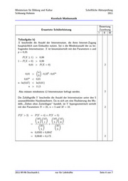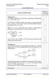 Ministerium für Bildung und Kultur Schriftliche Abiturprüfung Schleswig-Holstein 2011 Kernfach Mathematik Bewertung Erwartete Schülerleistung Zuordnung Teilaufgabe c) Die erwartete Anzahl der am ersten Tag zu erwartenden Verkäufe beträgt np = 1500 - 0,09 = 135. X beschreibt die Anzahl der Käufer eines Laptops. X ist binomialverteilt mit n = 1500, p = 0,09. k ist die Anzahl der bereitzustellenden Laptops. Es soll gelten P(X < k) > 0,98. Wegen 0? =n-p-q = 1500 - 0,09 - 0,91 = 122,85 > 9 ist die Laplace- Bedingung für die Näherung durch die Normalverteilung erfüllt. o[k+05-135\ , ho 122,85 k+0,5-135 122,85 also k > 134,5 + 2,06 - 122,85 = 157,33. Es müssen also mindestens 158 Laptops bereit gestellt werden. 2,06, Teilaufgabe d) Es ist p der Prozentsatz der anzuschreibenden Bevölkerung. A steht für Angeschriebene, N für nicht Angeschriebene und Z für Kunde bei Z-Tel. Baumdiagramm: Der Anteil p der Menschen in der Bevölkerung, die Kunde von Z-Tel werden, soll 4,5 % betragen, also muss p-0,2+ (1— p) - 0,03 = 0,045 gelten. Damit ist p - 0,17 = 0,015, also p = 0,088. Es müssen also ca. 8,8% der Bevölkerung angeschrieben werden. 2011-M-H6-Stochastik-L nur für Lehrkräfte Seite 7 von 7
