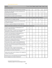 Table 6 Detailed Work Plan 2023 Overarching Activities Quarterly Information Notes and Operational Committees x III To Meetings with stakeholders to ensure coordination and . sr x x x x x x dissemination of outputs Facilitation for Libyan Delegations' active participation in 0 and u zuEn Cunn Accompaniment to a dialogue meeting? Support Libya with the development of a training module on aan m namen dialogues Trainings on migration | Trainings on migration dielogues for Libyan diplomats | for Libyan diplomats HH Support to the Libyan authorities in their efforts engaging Libyans living abroad Consular Crisis Preparedness and Management: ToT x X session in Malta for trainers Policy Support Action - Consular Crisis Preparedness and Br x Management: Development of Trainer’s Manual Consular Crisis Preparedness and Management: ToT X session on technical modules for trainers Consular Crisis Preparedness and Management: ToT x practice session with trainers and participants Good practices sharing working session on Consular Crisis X Preparedness and Management Strategy Policy Support Action - Support to the development of a Consular Crisis Preparedness and Management Strategy Kick-off workshop for the development of Networking and Outreach strategy Policy Support Action - Support to Libya with the development of a Networking and Outreach Strategy for the engagement of Libyans living abroad Study visit for a peer-to-peer exchange on the engagement of Libyans living abroad Working session on the Networking and Outreach Strategy . 2: X for the engagement of Libyans living abroad 9 Depending on agenda of the concerned dialogues for 2023 20