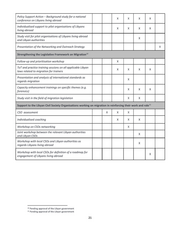 Policy Support Action - Background study for a national . .; x x x x conference on Libyans living abroad Individualised support to pilot organisations of Libyans .- x X x X living abroad Study visit for pilot organisations of Libyans living abroad and aan en nn authorities Presentation | Presentation ofthe Networking and Outreach Strategy the Networking and Outreach Strategy 1 HF the Legislative Framework on Migration’ | Follow-up and prioritisationworkshop —|—N and prioritisation workshop ToT and practice training sessions on all applicable Libyan laws related to migration for trainers Presentation and analysis of international standards as x regards migration Capacity enhancement trainings on specific themes (e.g. nn Study visit in the | Stuay visit in tn feld ofmigrationiegistation | of migration legislation IH Support to the Libyan Civil Society Organisations working on migration in reinforcing their work and role?! na —TbLebrD Merten oe TTrbrrn Joint workshop between the relevant Libyan authorities X and Libyan CSOs Workshop with local CSOs and Libyan authorities as . 2: x regards Libyans living abroad Workshop with local CSOs for definition of a roadmap for x engagement of Libyans living abroad 10 Pending approval of the Libyan government 11 Pending approval of the Libyan government 21