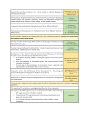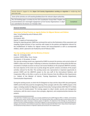 Activity Strand 4: Support to the Libyan Civil Society Organisations working on migration in reinforcing their work and roles CSO Briefing Paper ICMPD continued its strong engagement in the CSO Coordination Group, a forum of more than twenty international actors working in Libya with Libyan CSOs that aims at enhancing information sharing and cooperation among international actors on their work with Libyan organisation. The Group thus provides a space for international implementers to share good practices and lessons learned from their own experiences and offers the opportunity to avoid duplication of work and the overburdening of stakeholders. ICMPD closely collaborated with the Group in drafting a CSO briefing paper titled “Insights and recommendations for meaningful engagement of Civil Society Organisations in Libya”, which was finalised at the beginning of the reporting period. Throughout the drafting process, ICMPD actively participated to the Coordination Group to discuss the ideas for the structure of the paper as well as to coordinate and provide inputs during the editing process. The paper, which aims to provide a general understanding on what it means to work with Libyan CSOs as an international actor, as well as the main recommendations to follow when engaging with Libyan organisations, was submitted to the donors on 4 October 2022. Preparation as regards the activities to be implemented together with Libyan CSOs ICMPD is waiting for the MFA to give the approval to share the list of CSOs with which ICMPD is planning to work to the relevant Libyan authorities. ICMPD is keeping the CSOs constantly informed about the situation and its plans for the first activities to be implemented with them. Furthermore, the preparations for the implementation of such activities are proceeding smoothly, and ICMPD stands ready to proceed with all necessary logistical arrangements for their implementation. In addition, on 12 December 2022, ICMPD met with two CSO representatives, LELEEES III receive an update on their activities and to discuss potential future capacity enhancement activities. 6. Upcoming Plans The following project activities are planned and/or will be continued during the first quarter of 2023°: Activity Strand 1 - Facilitation for Libyan delegations’ active participation in international and regional migration dialogues: « Finalisation of the Migration Governance Training Curriculum; ® Potential accompaniment to the Khartoum Process Senior Officials’ Meeting (SOM) in Berlin, Germany from 15 — 16 March 2023 (pending confirmation of attendance by the Libyan stakeholders); Activity Strand 2 - Support to the Libyan authorities in their efforts with respect to consular crisis preparedness and management and engaging Libyans living abroad 6 Given the overall context and the political changes in Libya, some activities might need to be adapted/redesigned in accordance with the potentially changing context.