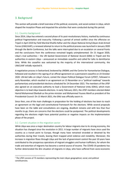 Libya’s Migration Technical Assistance Facility – Inception Report 3. Background This section will provide a brief overview of the political, economic, and social context in Libya, which shaped the Inception Phase and impacted the activities that were conducted during this period. 3.1. Country background Since 2014, Libya has entered a second phase of its post-revolutionary history, marked by continuous political fragmentation and insecurity. Following a period of armed conflict since the offensive on Tripoli in April 2019 by Field Marshal Khalifa Haftar and the Libyan National Army/Libyan Arab Armed Forces (LNA/LAAF), a renewed attempt to return to the political process was launched in January 2020 through the Berlin Conference, but the talks were interrupted due to an escalation on several fronts and the conclusions from the conference remained largely unimplemented. On 21 August 2020, Libya’s rival authorities – the UN backed Government of National Accord (GNA) in Tripoli and the authorities in eastern Libya – announced an immediate ceasefire and called for talks to demilitarize Sirte. While the ceasefire was welcomed by the majority of the international community, the LNA/LAAF initially rejected it. A negotiation process in Switzerland, brokered by UNSMIL and the Centre for Humanitarian Dialogue, followed and resulted in the signing of an official agreement on a permanent ceasefire on 23 October 2020. UN-led talks on Libya’s future, coined the Libyan Political Dialogue Forum (LPDF)1, followed in early November, which resulted in an agreement on 15 November on a “political roadmap” towards parliamentary and presidential elections scheduled for 24 December 2021. The members of the LPDF also agreed on an executive authority to lead a Government of National Unity (GNU), which main objective is to lead Libya towards elections. In early February 2021, the LPDF members elected Abdul Hamid Mohammed Dbeibah as the prime minister and Mohammed Younes Menfi as president of the Presidential Council. On 15 March 2021, the GNU was officially sworn in. Since then, one of the main challenges in preparation for the holding of elections has been to reach an agreement on the legal and constitutional framework for the elections. While several proposals have been on the table and consultations are ongoing, deadlock remains and with less than four months to go, there are concerns that the elections could be postponed. The political developments regarding the elections might have potential positive or negative impacts on the implementation phase of the project. 3.2. Current situation in the migration sector While Libya was once a major destination country for labour migrants due to its strong economy, the situation has changed since the revolution in 2011. A large number of migrants have since used the country as a transit point to Europe, though many have remained stranded or detained by the authorities during their travels, leaving them trapped amid violence and instability. Moreover, the increase in migration flows through Libya and the lack of government control the past 10 years have contributed to the prosperous operations of migrant smugglers and human traffickers, for whom the trade and extortion of migrants has become a central source of income. The COVID-19 pandemic has further deteriorated the dire situation of migrants in Libya, who have suffered from socio-economic 1 The LPDF consists of 75 members representing the main Libyan geographical, social, and political constituencies.