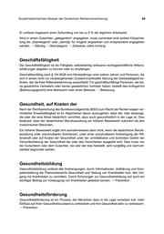 Sozialmedizinisches Glossar der Deutschen Rentenversicherung 49 Sozialmedizinisches Glossar der Deutschen Rentenversicherung 49 Er umfasst insgesamt einen Zeitumfang von bis zu 5 % der täglichen Arbeitszeit. Wird in einem Gutachten „gelegentlich“ angegeben, muss zumindest eine andere Körperhal- tung als „überwiegend“ oder „ständig“ für möglich angesehen und entsprechend angegeben werden. Ständig, Überwiegend, Zeitweise, siehe Anhang Geschäftsfähigkeit Die Geschäftsfähigkeit ist die Fähigkeit, selbstständig wirksame rechtsgeschäftliche Willens- erklärungen abgeben zu können oder zu empfangen. Geschäftsunfähig nach § 104 BGB sind Minderjährige unter sieben Jahren und Personen, die sich in einem nicht nur vorübergehenden Zustand krankhafter Störung der Geistestätigkeit be- finden, der die freie Willensbestimmung ausschließt. Für geschäftsunfähige Personen, die kei- ne gesetzliche Vertreterin oder keinen gesetzlichen Vertreter haben, bestellt das Amtsgericht (Betreuungsgericht) eine Betreuerin oder einen Betreuer. Betreuung Gesundheit, auf Kosten der Nach der Rechtsprechung des Bundessozialgerichts (BSG) zum Recht der Renten wegen ver- minderter Erwerbsfähigkeit ist im Allgemeinen davon auszugehen, dass die- oder derjenige, die oder der eine Arbeit tatsächlich verrichtet, dazu auch gesundheitlich in der Lage ist. Dies bedeutet, dass der tatsächlichen Berufsausübung ein höherer Beweiswert zukommt als den medizinischen Befunden. Ein höherer Beweiswert ergibt sich ausnahmsweise dann nicht, wenn die tatsächliche Berufs- ausübung unter unzumutbaren Schmerzen, unter einer unzumutbaren Anstrengung der Wil- lenskraft oder auf Kosten der Gesundheit unter der unmittelbaren und konkreten Gefahr der Verschlechterung der Gesundheit der oder des Versicherten ausgeübt wird. Dies muss von der Gutachterin oder dem Gutachter, die oder der dies feststellt, sehr sorgfältig und nachvoll- ziehbar begründet werden. Gesundheitsbildung Gesundheitsbildung umfasst alle Anstrengungen, durch Informationen, Aufklärung und Kom- petenzbildung die Themenbereiche Gesundheit und Heilung von Krankheiten bzw. den Um- gang mit Krankheiten zu vermitteln. Durch Schulungen zur Gesundheitsbildung soll auch ein wichtiger Beitrag zur Vorbeugung von Krankheiten geleistet werden. Prävention Gesundheitsförderung Gesundheitsförderung ist ein Prozess, der Menschen dazu in die Lage versetzen soll, mehr Einfluss auf ihren Gesundheitszustand zu entwickeln und ihre Gesundheit aktiv zu verbessern. Prävention