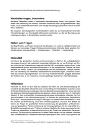 Sozialmedizinisches Glossar der Deutschen Rentenversicherung 53 Sozialmedizinisches Glossar der Deutschen Rentenversicherung 53 Hautbelastungen, besondere Berufliche Tätigkeiten können zu besonderen Hautbelastungen führen. Dazu gehören Tätig- keiten unter Einwirkung von Schmutz, toxischen Substanzen oder Lösungsmitteln sowie Tätig- keiten, die zu Hautirritationen führen, eine häufige Hautreinigung erfordern oder im feuchten Milieu stattfinden. Bei einzelnen dermatologischen Krankheitsbildern sollten die zu Hautirritationen führenden Arbeitshandlungen und Arbeitsstoffe differenziert beschrieben und bei der Beurteilung des Leistungsvermögens im Erwerbsleben bewertet werden. Heben und Tragen Der Begriff Heben und Tragen bezeichnet das Bewegen von Lasten in vertikaler (Heben und Senken) und horizontaler (Tragen) Richtung ohne technische Hilfsmittel. Dabei spielt die Kör- perhaltung eine besondere Rolle. Arbeitsschwere, Hilfsmittel, Körperhaltung Heilmittel Versicherte der gesetzlichen Krankenversicherung haben im Rahmen der vertragsärztlichen Versorgung Anspruch auf medizinisch notwendige Heilmittel, die nur von Ärztinnen und Ärz- ten, und unter der Voraussetzung, dass das Heilmittel hilft, verschrieben werden dürfen. Unter Heilmittel werden ärztlich verordnete Maßnahmen z. B. der physikalischen Therapie, der Ergo- therapie, der Stimm-, Sprech- und Sprachtherapie und der podologischen Therapie verstan- den. Die Verordnung von Heilmitteln, insbesondere die Voraussetzungen, Grundsätze und In- halte der Verordnungsmöglichkeiten, ist in der sog. Heilmittel-Richtlinie geregelt. Bestandteil der Richtlinie ist u. a. ein Verzeichnis verordnungsfähiger Maßnahmen (Heilmittelkatalog). Hilfsmittel Hilfsmittel (im Sinne von § 47 SGB IX) umfassen die Hilfen, die unter Berücksichtigung der Umstände des Einzelfalls erforderlich sind, um den Erfolg einer Rehabilitation zu sichern, einer drohenden Behinderung vorzubeugen oder eine Behinderung auszugleichen, soweit sie nicht als allgemeine Gebrauchsgegenstände des täglichen Lebens anzusehen sind. Zu Hilfsmitteln zählen z. B. Seh- und Hörhilfen, Körperersatzstücke sowie orthopädische Hilfsmittel. Die Trä- gerzuständigkeit für die Hilfsmittelversorgung48 im Rahmen der medizinischen Rehabilitation richtet sich – entsprechend der sonstigen Leistungen zur medizinischen Rehabilitation – nach der Ursache der Behinderung, nach dem Versicherungsstatus und nach dem Bedarf. So können die Träger der gesetzlichen Krankenversicherung, der gesetzlichen Unfallversiche- rung, der gesetzlichen Rentenversicherung, der Versorgungsträger und der Jugendhilfe bzw. Sozialhilfeträger zuständig sein. Probleme entstehen häufig bei der Abgrenzung zwischen den Trägern der gesetzlichen Krankenversicherung und den Trägern der gesetzlichen Rentenver- sicherung. Die Abgrenzung orientiert sich in diesen Fällen danach, ob das begehrte Hilfsmittel dem unmittelbaren bzw. mittelbaren Behinderungsausgleich dient (dann Leistungspflicht der 48 Kommentar: Nellissen, in: Schlegel/Voelzke, jurisPK-SGB IX, 3. Auflage, § 47 SGB IX (Stand: 21.04.2020).