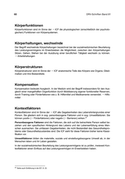 60 DRV-Schriften Band 81 60 DRV-Schriften Band 81 Körperfunktionen Körperfunktionen sind im Sinne der ICF die physiologischen (einschließlich der psycholo- gischen) Funktionen von Körpersystemen. Körperhaltungen, wechselnde Der Begriff wechselnde Körperhaltungen bezeichnet bei der sozialmedizinischen Beurteilung des Leistungsvermögens im Erwerbsleben die Möglichkeit, zwischen den Körperhaltungen Sitzen, Gehen, Stehen bei der Ausübung einer beruflichen Tätigkeit wechseln zu können. Arbeitshaltungen Körperstrukturen Körperstrukturen sind im Sinne der ICF anatomische Teile des Körpers wie Organe, Glied- maßen und ihre Bestandteile. Kompensation Kompensation bedeutet Ausgleich. In der Medizin wird der Begriff insbesondere für den Aus- gleich einer mangelhaften Organfunktion durch Mobilisierung eigener funktioneller Reserven, durch Training oder Förderfaktoren wie z. B. Hilfsmittel und Medikamente verwendet. Hilfs- mittel Kontextfaktoren Kontextfaktoren sind im Sinne der ICF alle Gegebenheiten des Lebenshintergrundes einer Person. Sie gliedern sich in sog. personbezogene Faktoren und in sog. Umweltfaktoren. Sie können positiv ( Förderfaktoren) oder negativ ( Barrieren) wirken.57 Personbezogene Faktoren sind die Faktoren, die sich auf die betrachtete Person selbst be- ziehen und den spezifischen Hintergrund des Lebens und der Lebenserfüllung eines Men- schen ausmachen. Sie umfassen Gegebenheiten, die nicht Bestandteil des Gesundheitspro- blems oder Gesundheitszustandes sind. Die ICF sieht für diese Faktoren bisher keine Klassi- fikation vor. Umweltfaktoren bilden die materielle, soziale und einstellungsbezogene Umwelt ab, in der Menschen leben und ihr Leben gestalten. In der sozialmedizinischen Beurteilung des Leistungsvermögens ist zu prüfen, inwieweit Kon- textfaktoren einen Einfluss auf das Leistungsvermögen im Erwerbsleben haben. 57 Siehe auch Einführung in die ICF, S. 23.