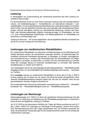 Sozialmedizinisches Glossar der Deutschen Rentenversicherung 63 Sozialmedizinisches Glossar der Deutschen Rentenversicherung 63 Leistung In Abhängigkeit vom Zusammenhang der Verwendung bezeichnet das Wort Leistung ver- schiedene Sachverhalte. Für die Sozialmedizin ist die von einer Person erbrachte Leistung unter den derzeitig üblichen Lebens- und Arbeitsbedingungen ( Kontextfaktoren) von besonderem Interesse ( Leis- tungsfähigkeit). Für die sozialmedizinische Beurteilung des Leistungsvermögens im Erwerbs- leben ist aber nicht die tatsächlich erbrachte oder unter optimalen oder standardisierten Bedin- gungen maximal erbringbare Leistung von entscheidender Bedeutung, sondern das krank- heits- oder behinderungsbedingte mögliche Leistungsvermögen im Erwerbsleben, bei dem z. B. auch krankheitsbedingte Gefährdungs- und Belastungsfaktoren im Arbeitsalltag ent- sprechend zu berücksichtigen sind. Leistung im Sinne der ICF ist eine tatsächliche, real durchgeführte Aktivität und bezieht sich auf die Art und den Umfang ihrer Durchführung. Leistungen zur medizinischen Rehabilitation Zur medizinischen Rehabilitation von Menschen mit Behinderungen und von Behinderung be- drohter Menschen werden die erforderlichen Leistungen erbracht, um Behinderungen ein- schließlich chronischer Krankheiten abzuwenden, zu beseitigen, zu mindern, auszugleichen, eine Verschlimmerung zu verhüten oder Einschränkungen der Erwerbsfähigkeit und Pflege- bedürftigkeit zu vermeiden, zu überwinden, zu mindern und eine Verschlimmerung zu verhüten sowie den vorzeitigen Bezug von laufenden Sozialleistungen zu vermeiden oder laufende Sozialleistungen zu mindern (§ 42 SGB IX). Vom Gesetzgeber sind für die Leistungsträger jeweils trägerspezifische Rehabilitationsziele festgelegt worden. Für die Zuständigkeit der Sozialleistungsträger siehe Anhang Leistungen zur Teilhabe. Eine vorzeitige Leistung zur medizinischen Rehabilitation im Sinne des § 12 Abs. 2 SGB VI ist eine Leistung, die vor Ablauf von vier Jahren nach Ende der letzten durchgeführten medi- zinischen Rehabilitationsleistung erbracht werden soll. Sie wird nur erbracht, wenn sie aus gesundheitlichen Gründen dringend erforderlich ist. Die sozialmedizinische Prüfung der individuellen Voraussetzungen umfasst den Rehabilita- tionsbedarf, die Rehabilitationsfähigkeit sowie die Rehabilitationsprognose. Leistungen zur Nachsorge Nachsorgeleistungen (§ 17 SGB VI im Sinne der gesetzlichen Rentenversicherung) sind alle Leistungen zur Sicherung und Stabilisierung des Rehabilitationsergebnisses im Zusammen- hang mit einer durchgeführten Leistung zur Teilhabe. Am 01.07.2018 ist die Gemeinsame Richtlinie der Träger der Rentenversicherung nach § 17 Abs. 2 Satz 1 SGB VI für Leistungen zur Nachsorge in Kraft getreten, wodurch eine einheit- liche Rechtsanwendung durch alle Träger gewährleistet wird. Die Richtlinie beschreibt die Ziele, die persönlichen Voraussetzungen für die Inanspruchnahme sowie Art und Umfang der medizinischen Leistungen.