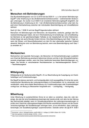 70 DRV-Schriften Band 81 70 DRV-Schriften Band 81 Menschen mit Behinderungen Das Bundesteilhabegesetz vom 23.12.2016 hat das SGB IX – u. a. bei seinem Behinderungs- begriff70 unter Anlehnung an die UN-Behindertenrechtskonvention – weitreichenden Änderun- gen unterzogen. So wurde in § 2 SGB IX ein erweiterter Behinderungsbegriff eingeführt, der die Behinderung in Anlehnung an Art. 1 der UN-Behindertenrechtskonvention unter dem As- pekt einer Wechselwirkung zwischen der individuellen Beeinträchtigung und Umweltfaktoren definiert. Nach § 2 Abs. 1 SGB IX wird der Begriff folgendermaßen definiert: Menschen mit Behinderungen sind Menschen, die körperliche, seelische, geistige oder Sin- nesbeeinträchtigungen haben, die sie in Wechselwirkung mit einstellungs- und umweltbeding- ten Barrieren an der gleichberechtigten Teilhabe an der Gesellschaft mit hoher Wahrschein- lichkeit länger als sechs Monate hindern können. Eine Beeinträchtigung nach Satz 1 liegt vor, wenn der Körper- und Gesundheitszustand von dem für das Lebensalter typischen Zustand abweicht. Menschen sind von Behinderung bedroht, wenn eine Beeinträchtigung nach Satz 1 zu erwarten ist.71 Merkzeichen Merkzeichen sind spezielle Kennungen, die Menschen mit Schwerbehinderungen zusätzlich zum Grad der Behinderung anerkannt bekommen können und die in den Schwerbehinderten- ausweis eingetragen werden, wenn bei ihnen bestimmte besondere Beeinträchtigungen vor- liegen. Sie können in verschiedenen Rechtsbereichen zu Nachteilsausgleichen führen.72 Nachteilsausgleich Mittelgradig Mittelgradig ist ein häufig benutzter Begriff z. B. zur Beschreibung der Ausprägung von Krank- heitsfolgen und Funktionsstörungen. Der Begriff ist ebenso wie leicht- und hochgradig allein nicht aussagefähig. Er ist bei der sozial- medizinischen Beurteilung des Leistungsvermögens im Erwerbsleben nur zu verwenden und verständlich, wenn eine exakte Beschreibung von Funktionsstörungen oder Krankheitsfolgen vorliegt bzw. ein Bezug zu Messwerten hergestellt wird. Leichtgradig, Hochgradig Mitwirkung Unter Mitwirkung im sozialrechtlichen Sinne ist vor allem zu verstehen, dass die- oder der- jenige, die oder der eine Sozialleistung beantragt oder bereits erhält, sich aktiv bei der Klärung des Sachverhalts beteiligt, wenn im Verwaltungsverfahren die Leistungsvoraussetzungen zu prüfen sind. Damit die Leistungsberechtigten ihre Rechte verwirklichen können und der Sozial- versicherungsträger die Sozialleistungen erbringen kann, ist es erforderlich, dass Leistungs- berechtigte und Sozialleistungsträger zusammenwirken. Deshalb sehen die §§ 60 ff. SGB I 70 Kommentar: Luthe in: Schlegel/Voelzke, jurisPK-SGB IX, 3. Auflage, § 2 SGB IX (Stand: 09.11.2018). 71 http://www.gesetze-im-internet.de/sgb_9_2018/__2.html 72 https://www.schwerbehindertenausweis.de/behinderung/ausweis/die-merkzeichen