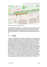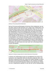 Planfall 3 - RegioTram Expresslinien ab Kassel Wilhelmshöhe schiebung der Umfahrung in Richtung Messe bzw. in Richtung Bahnhof Bettenhau- sen ist aufgrund der einzuhaltender Abstände nicht möglich. Aus Kassel kommend befindet sich das künftige Einfahrsignal des Bahnhofes Bettenhausen bei km 11+050. Dieses Signal muss gegenüber dem heutigen Ausfahrsignal bei km 11+000 um ca. 50 m verschoben werden. Somit lassen sich die notwendigen Ab- stände zur Weiche 1 im Bahnhof Bettenhausen als auch zur Weiche bei km 10+604 am Bahnhof Waldau einhalten. In Richtung der Messe Kassel ist die Signalisierung auf den dort vorhandenen Abzweig zum Industriegleisanschluss Waldau abzustim- men. Dabei bleibt das Deckungssignal bei km 9+000 bestehen. Somit kommt die Weiche der Umfahrung Waldau bei km 9+446 mit dem Grenzzeichen bei 9+500 zum Liegen. Die Signale sind so positioniert, dass sie 200 m Durchrutschweg zur nachfolgenden Weiche gewährleisten. Die Signalisierung lässt aufgrund der Ab- stände der Weichen und Signale kaum mehr als die geplante Aufstelllänge für Gü- terzüge von 740 m zu. Diese Vorgabe wurde von Seiten der DB AG zu Projektstart gemacht. Die geplante Signalisierung ist dem Lageplan „Waldau-Umfahrung Waldau“ zu entnehmen. Abbildung 40: Planung Umfahrung Waldau Wichtig für die Maßnahmen in Waldau in Planfall 3 ist die Einbindung in ein neu zu errichtendes DSTW am Bahnhof Bettenhausen. Im jetzigen Stellwerk ist eine Er- weiterung mit der neuen Signalisierung nicht mehr möglich. Eine in der Peripherie notwendige Anpassung betrifft den vorhandenen Waldauer Fußweg nördlich der B83. Durch die Erweiterung der Gleisanlage ist dieser ent- sprechend auf einer Länge von ca. 850 bis 900 m zu verlegen. Zusätzlich wird auf Höhe der Aral-Tankstelle an der Kreuzung B83/ Nürnberger Straße ein neuer Halt in Waldau angeordnet. TTK GmbH 03/21 Seite 79/98