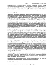 - 10 - Bearbeitungsstand: 20.12.2023 16:01 Die Bundesregierung hat für eine zeitweise Absenkung weiterhin die Finanzlage der BA und deren voraussichtliche Entwicklung zu berücksichtigen. Durch die zusätzliche Voraus- setzung wird verhindert, dass eine positive Beurteilung und Prognose für eine zeitweise Beitragssatzsenkung ausreichend ist, wenn die BA nicht zuvor eine erhebliche Rücklage gebildet hat. Dies erhöht die Rechtssicherheit für die BA und die Beitragszahlenden. Zu Nummer 2 (§ 363) Zur Erhaltung der Liquidität der BA stellte der Bund dieser in den Jahren 2020 und 2021 unterjährig umfangreiche Liquiditätshilfen zur Verfügung, wovon ein Betrag von insgesamt rund 23,8 Milliarden Euro von der BA am Jahresende zum Haushaltsausgleich benötigt wurde und abweichend von § 365 SGB III nicht an den Bund zurückgeführt werden musste. Der Bund hat sich damit in dieser Höhe in den Jahren 2020 und 2021 direkt an der Finan- zierung des Haushalts der BA beteiligt. Dies war während der Covid-19-Pandemie von be- sonderer Bedeutung. Denn die BA hat insbesondere mit der Leistung des Kurzarbeitergel- des in erheblichem Maße dazu beigetragen, die Folgen der Covid-19-Pandemie auf dem Arbeitsmarkt und für die Wirtschaft abzumildern. Die Nutzung von Kurzarbeit erreichte in der Corona-Pandemie einen zuvor nie dagewesenen Umfang und hat sich erneut als zent- rale Maßnahme der Krisenbewältigung für den Arbeitsmarkt bewährt. Die Entstehung weit- reichender Arbeitslosigkeit mit deutlichen finanziellen Folgen auch für den Beitragshaushalt konnte so verhindert werden. Die Leistungen des Bundes kamen den Beitragszahlenden unmittelbar zugute. Durch die Finanzierungsbeteiligung des Bundes konnte sich der Haushalt der BA konsolidieren. Die BA wird im Jahr 2023 aus den Überschüssen der Einnahmen über die Ausgaben eine Rück- lage bilden können. Damit ist es der BA möglich, in den Jahren 2024 bis 2027 gegenüber dem Bund einen teilweisen Ausgleich für die erheblichen Zuschüsse der Jahre 2020 und 2021 zu leisten. Die Aufteilung des Finanzierungsbeitrags in vier Jahrestranchen ist so be- messen, dass sie die Beitragssatzstabilität nicht gefährdet und die BA nach den aktuellen Finanzschätzungen weiterhin Rücklagen aufbauen kann, wenn auch in geringerem Umfang als bisher geplant. In den Jahren 2020 bis 2022 hat die BA insgesamt rund 18,6 Milliarden Euro für die Erstat- tung der Sozialversicherungsbeiträge an die Arbeitgeber während des Bezugs von Kurzar- beitergeld verausgabt. Diese Leistung gehört nicht zu den sozialversicherungsrechtlichen Ansprüchen der Arbeitnehmerinnen und Arbeitnehmer. Damit ergibt sich eine Differenz von rund 5,2 Milliarden Euro zu den in den Jahren 2020 und 2021 geleisteten Zahlungen des Bundes in Höhe von insgesamt rund 23,8 Milliarden Euro. Diese Mittel wurden von der BA nicht für die Erstattung von Sozialversicherungsbeiträgen an die Arbeitgeber während des Bezugs von Kurzarbeitergeld benötigt. Es ist entsprechend sachgerecht, dass die BA diese über die Ausgaben für die Erstattung der Sozialversicherungsbeiträge hinausgehenden Zahlungen dem Bund erstattet. Die Erstattung soll in den Jahren 2024 bis 2027 in vier Tranchen in Höhe von insgesamt 5,2 Milliarden an den Bund gezahlt werden. Bei der gebotenen Gesamtbetrachtung des Zeitraums von 2020 bis 2027 besteht mithin weiterhin ein deutlich positiver Saldo zugunsten der BA und damit der Beitragszahlenden. Die Aufteilung der Zahlungsverpflichtungen auf vier Jahre ist erforderlich, um der BA in jedem dieser Jahre einen positiven Finanzierungssaldo zu ermöglichen. Zu Artikel 3 (Inkrafttreten) Es wird das Inkrafttreten am Tag nach der Verkündung geregelt.