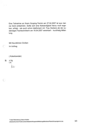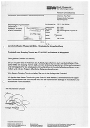 2) Eine Teilnahme an Ihrem Scoping-Termin am 27.04.2007 ist aus mei- ner Sicht entbehrlich. Sollte sich eine Notwendigkeit hierzu noch erge- ben, erfolgt - wie auch schon telefonisch mit Frau Deckers als der zu- ständigen Fachtechnikerin am 16.04.2007 vereinbart - kurzfristig Mittei- lung. Mit freundlichen Grüßen Im Auftrag ( Kolenbrander) z.Vg. A. ko T:\dez51\Büroleitung [ Bauer-Harden ]\DateienKummer\Texte\Landschaftspläne\Wuppertal\MitteilungöffentlicherPlänefürScopingtermin.doc 3/3