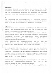 Begründung: Nach Ziffer 1.2.4.1 des Runderlasses des Ministers für Umwelt, Raumordnung und Landwirtschaft vom 09.09.1988 sind Festsetzungen, die eine vorübergehende Erhaltung der Landschaft zum Gegenstand haben, mit einer dies klarstellenden Erläuterung zu versehen. 3. Die Festsetzung des Entwicklungsziels 6.1 “temporäre Erhaltung” östlich der B 51 im Bereich “Auf dem Gleichen-Jägerhaus” (Quadrant 8679) ist in das Entwicklungsziel 1 “Erhaltung” umzuwandeln. Begründung: Die Festsetzung eines temporären Entwicklungsziels dokumentiert die Absicht, den landschaftlichen status quo bis zur Umsetzung einer anderen (z. B. baulichen) Planung zu erhalten. Der hier zu beachtende und abstimmungsrelevante Gebiets- entwickingsplan enthält auf der fraglichen Fläche die Darstellungen “Allgemeiner Freiraum- und Agrarbereich” sowie überlagernd “Regionaler Grünzug” und “Bereich für den Schutz der Landschaft und landschaftsorientierte Erholung”. Unter Beachtung der Rahmenplanfunktion des GEP .muss der . Landschaftsplan nach S 16 Abs. 2 LG die dort manifestierten Ziele auf örtlicher Ebene umsetzen, detaillieren und ergänzen. Im. vorliegenden Fall kann dies nur durch eine auf dauerhaften Bestand ausgerichtete Festsetzung (hier: Entwicklungsziels’ 1 “Erhaltung”) geschehen, da der Landschaftsrahmenplan langfristige Aussagen trifft und somit eine lediglich temporäre entsprechende Festsetzung im Landschaftsplan zur Erfüllung des Abstimmungsgebotes ‘.des $S 16 Abs. 2 LG nicht ausreicht. Als Begründung für eine temporäre Festsetzung kann auch nicht eine beabsichtigte . Flächennutzungsplanänderung, die....sich....in der Vorentwurfsphase befindet, herangezogen werden. Durch diese Vorgehensweise wird die Abstimmungspflicht des