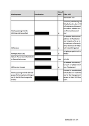 Koordination Ey Pläne 2022 TAG Covid-Forschungsvorhaben rein AG wird aufgelöst Start des Dashboards GEDA 2019/2020-EHIS, März 2022; Fortsetzung der Arbeit an einem Dash- board für GEDA 2021; TAG-Mitglieder bringen ihre Expertise in die neue AG HIS ein; TAG Dash- board geht perspektivisch TAG Dashboard Abt. 2 im HIS auf Aktuell keine konkreten TAG PH-Surveillance AG Datenspende Pläne zur Reaktivierung der TAG Kl TAG geht in der AG PH- Surveillance auf Begleitung/Steuerung GEDA-Studie (bis die neuen Strukturen entspr. Strategiekonzept etabliert sind) Austausch/Vernetzung von Mitarbeitenden, die im RKI zu Migration und Gesund- heit arbeiten (aktuelles Ar- beitsgebiet: Gesundheit von Geflüchteten aus der Ukraine) AG GEDA . Abteilungsübergreifende AG Migration Austausch/Vernetzung von Mitarbeitenden mit Kom- munikationsaufgaben im RKI (2017 initiiert vom Prä- sidenten) Abteilungsübergreifende Exper- tengruppe Fachkommunikation Austausch/Vernetzung von Mitarbeitenden, die im RKI Abteilungsübergreifende in partizipativen Projekten IG Partizipation arbeiten bzw. am Thema Seite 99 von 104