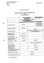 2022/0355114, Anlage A BMF -LAS3- Entwurf eines Zeitplans GE Absenkung Energiesteuer Koalitionsinitiative Stand: 29.03.22 Kabinettbeschluss 27.04.22 _ |(Fristverkürzung) Hinweis: Üblicherweise wird eine zusätzliche Beratung im Finanzausschuss anberaumt. Fraktionsbeschluss | 10.05.22 Bundestag, 1. Lesung 13.05.22 BT-FA 1. Dg. (Vorratsbeschluss) I 11.05.22 47 Anhörung im BT-Finanzausschuss | 16.05.22 Abschließende Beratung im BT-Finanzausschuss 18.05.22 [Bundestag, 2.13. Lesung 19.05.22 (Fristverzicht erforderlich oder 2/3-Mehrheit der Anwesenden) Da Beschlussfassung Bundesrat 20.05.22 Dieser Termin müsste hier entfallen. Ggfs. ist begleitende politische Kommunikation sinnvoll.